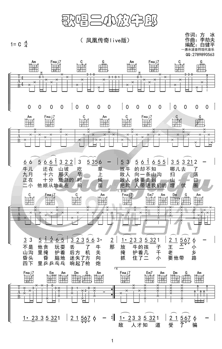 曲谱介绍: 凤凰传奇《歌唱二小放牛郎》吉他弹唱谱,采用C调指法编配,共有3张高清图谱。