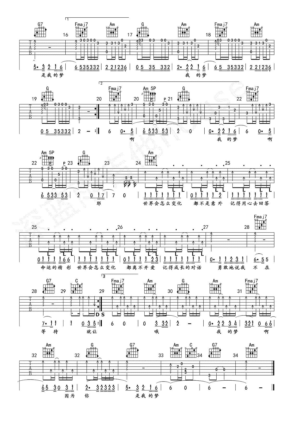曲谱介绍: 张靓颖《我的梦》吉他弹唱谱,采用C调指法编配原版,共有2张高清图谱,免翻页排版设计。