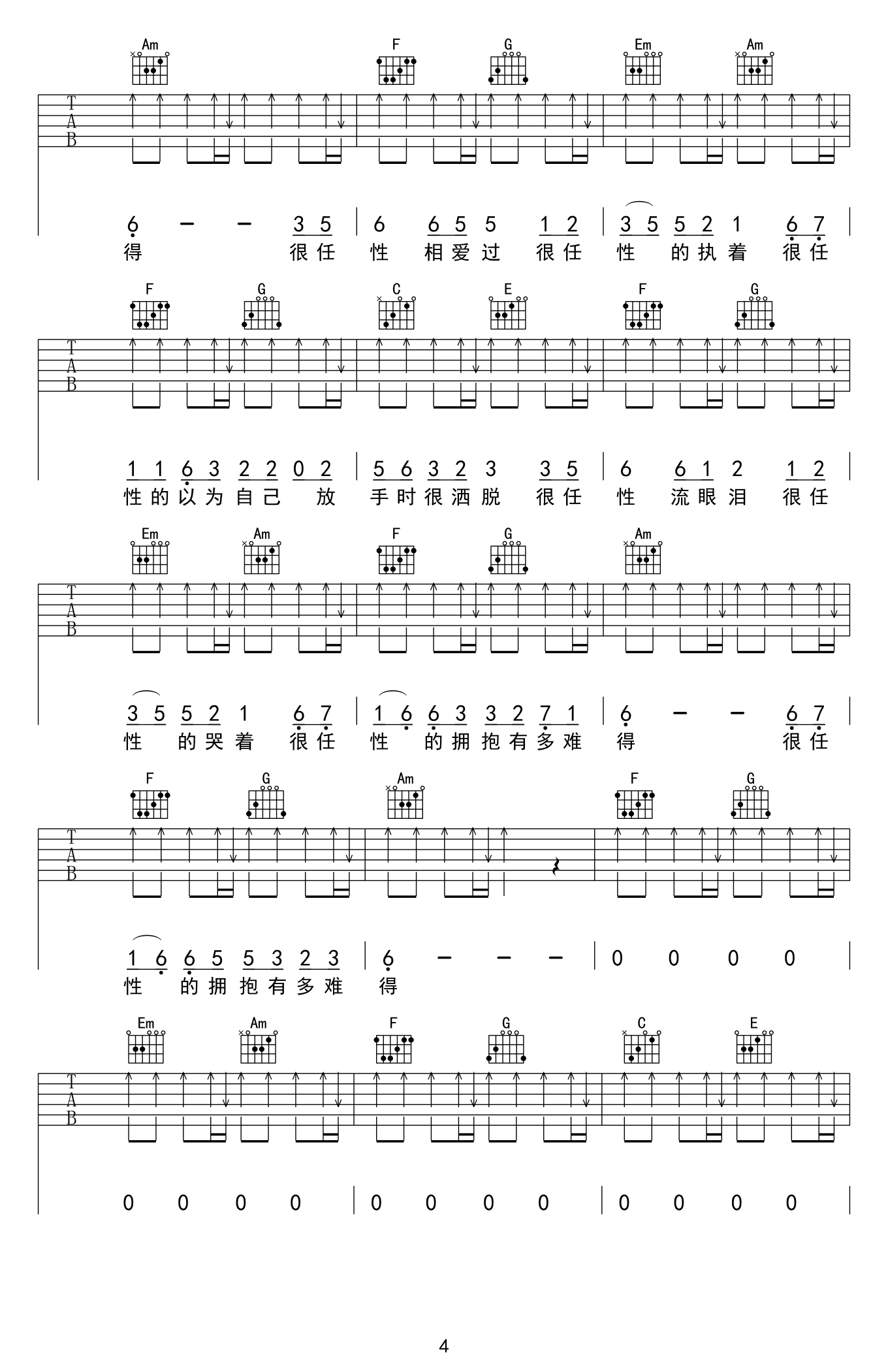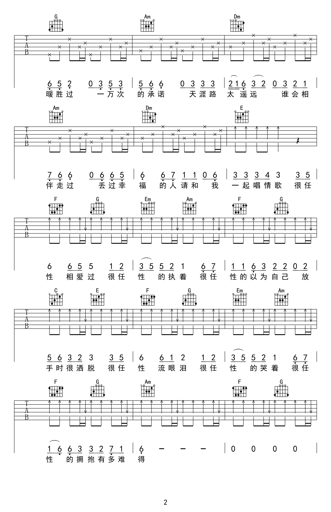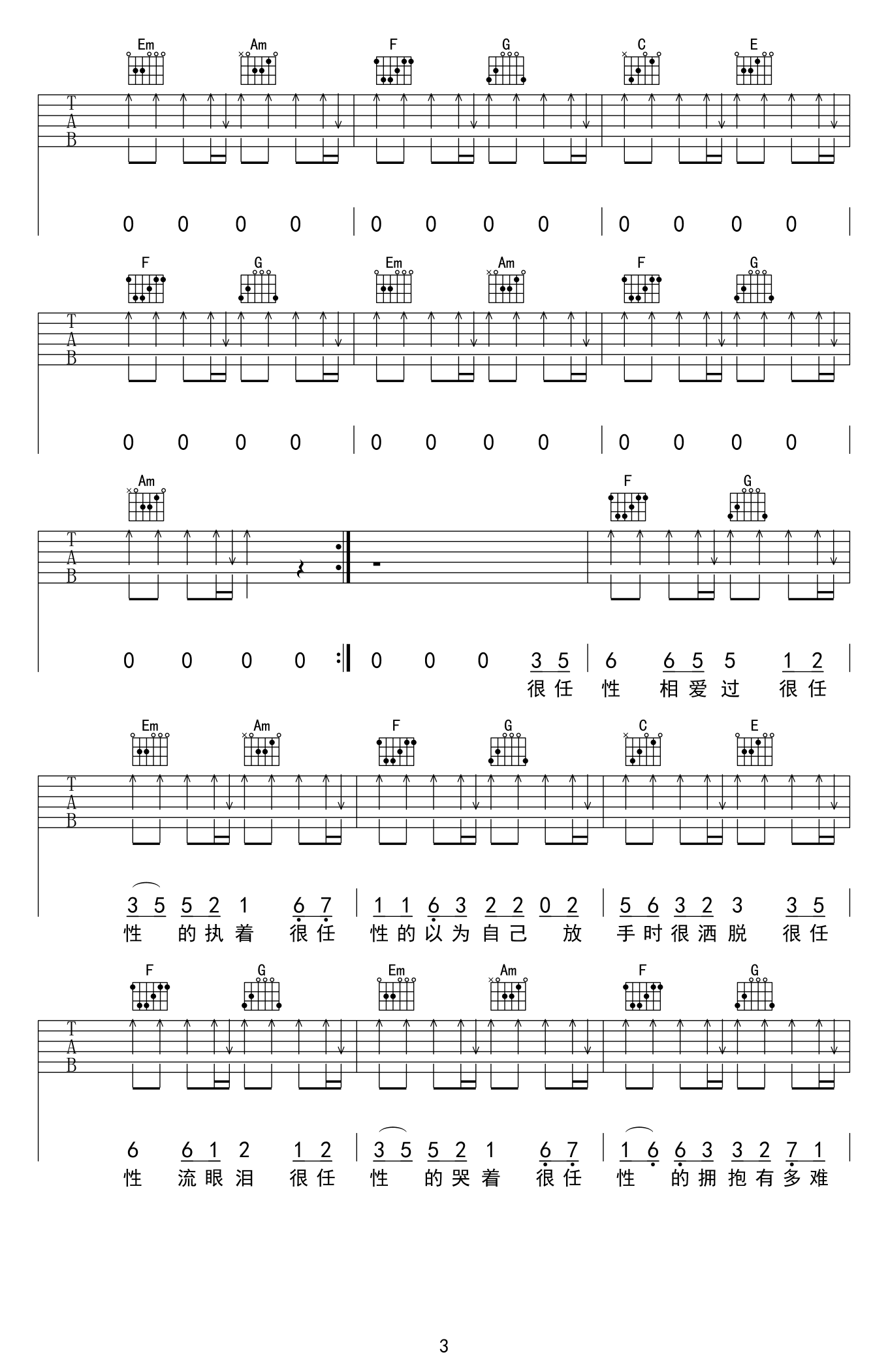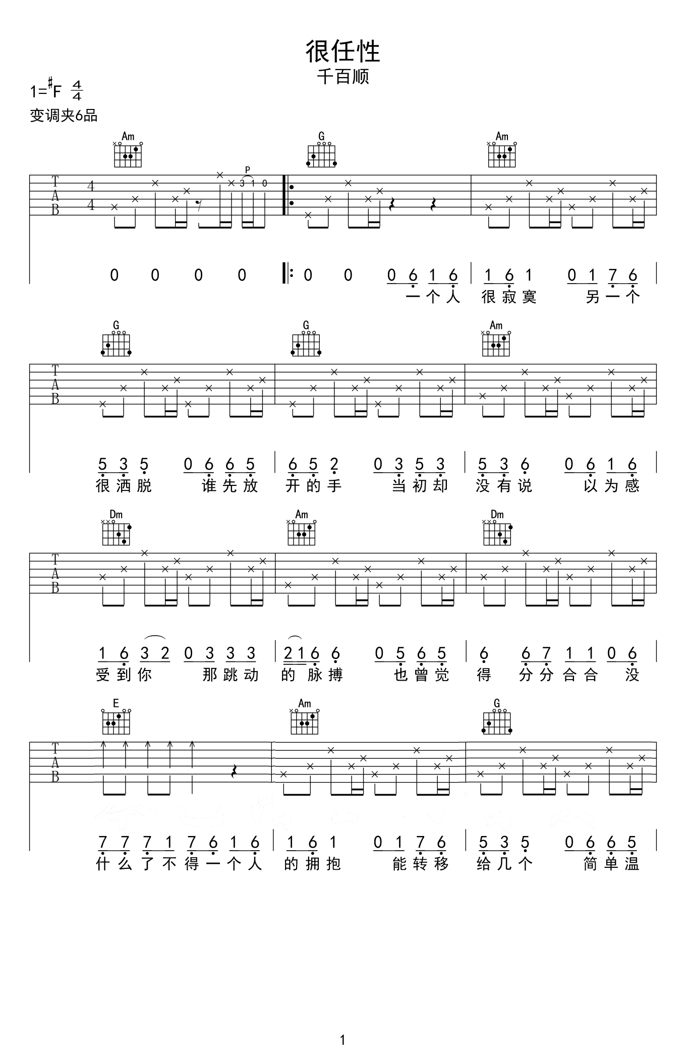 曲谱介绍: 千百顺《很任性》吉他弹唱谱,采用C调指法编配,共有5张高清图谱。