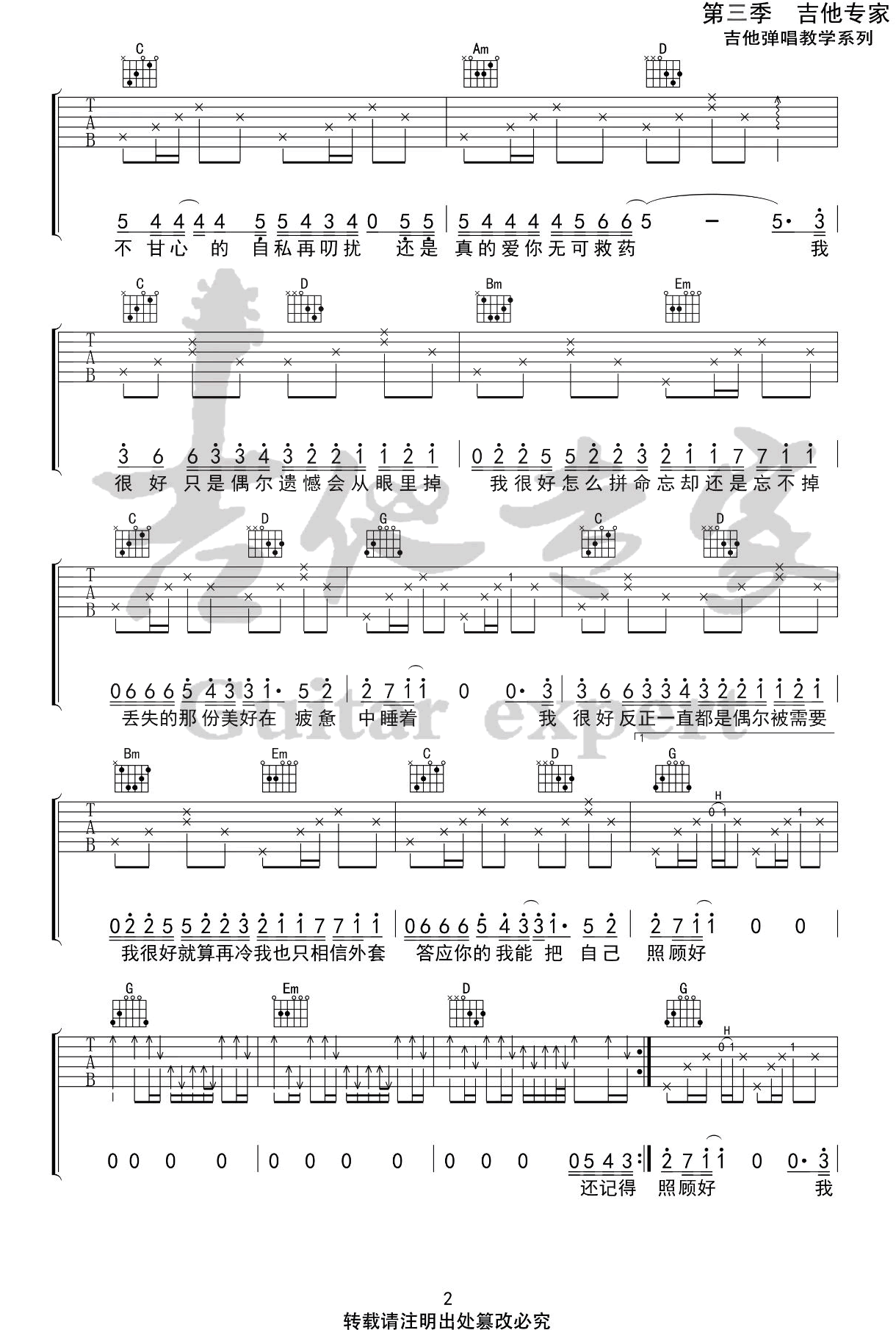 曲谱介绍: 刘大壮《我很好》吉他弹唱谱,采用C调指法编配,共有3张高清图谱。