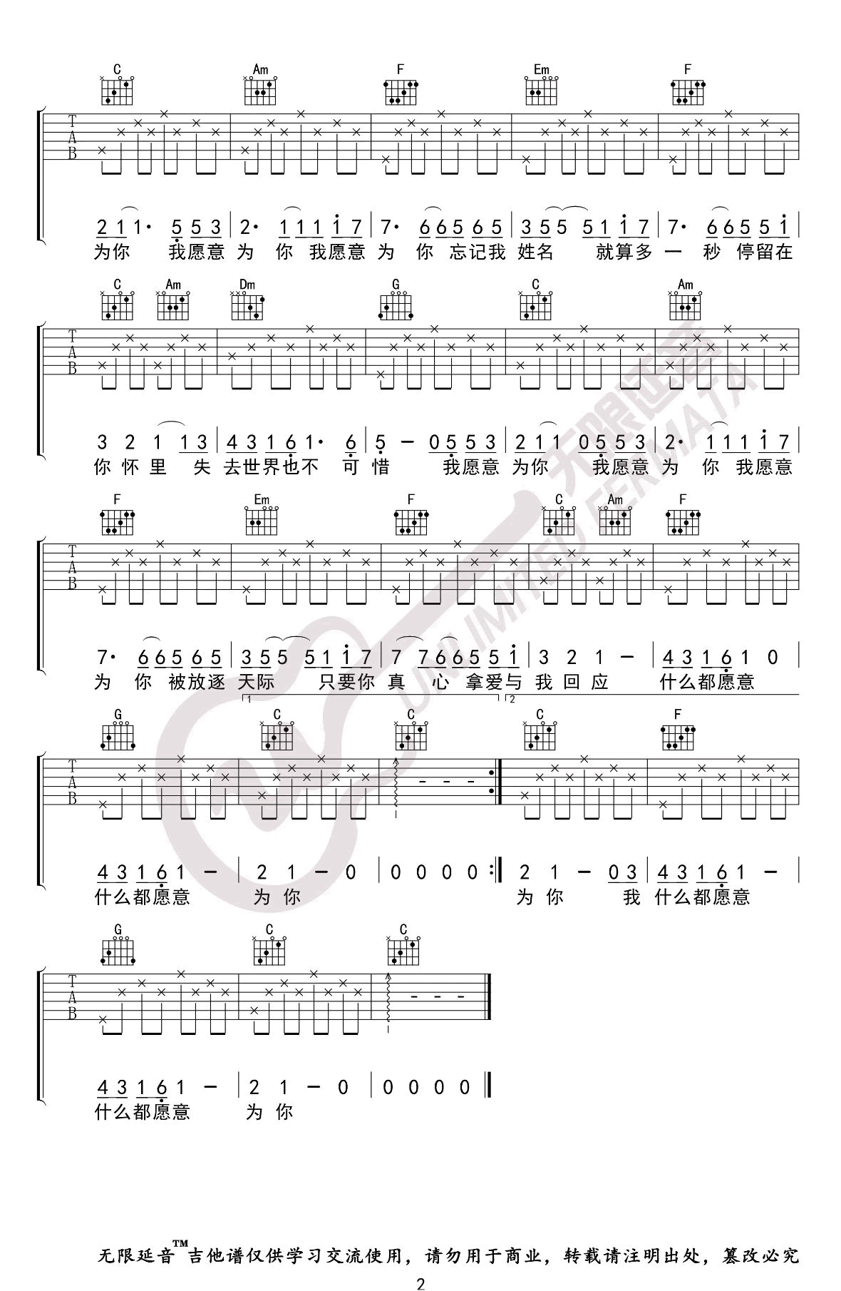 曲谱介绍: 王菲《我愿意》吉他弹唱谱,采用C调指法编配,共有2张高清图谱,免翻页排版设计。