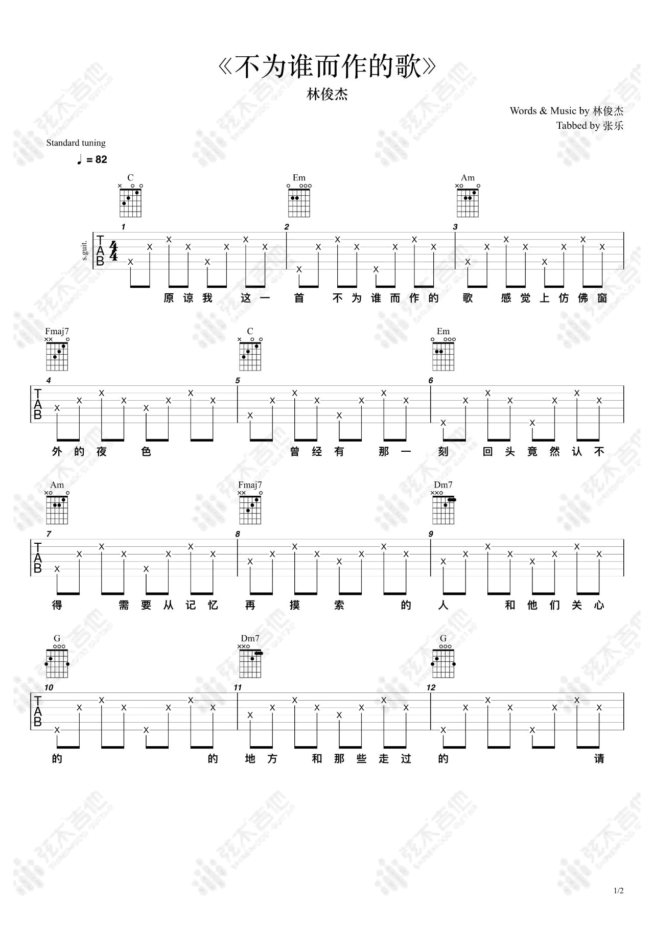 曲谱介绍: 林俊杰《不为谁而作的歌》吉他弹唱谱,采用C调指法编配,共有2张高清图谱,免翻页排版设计。