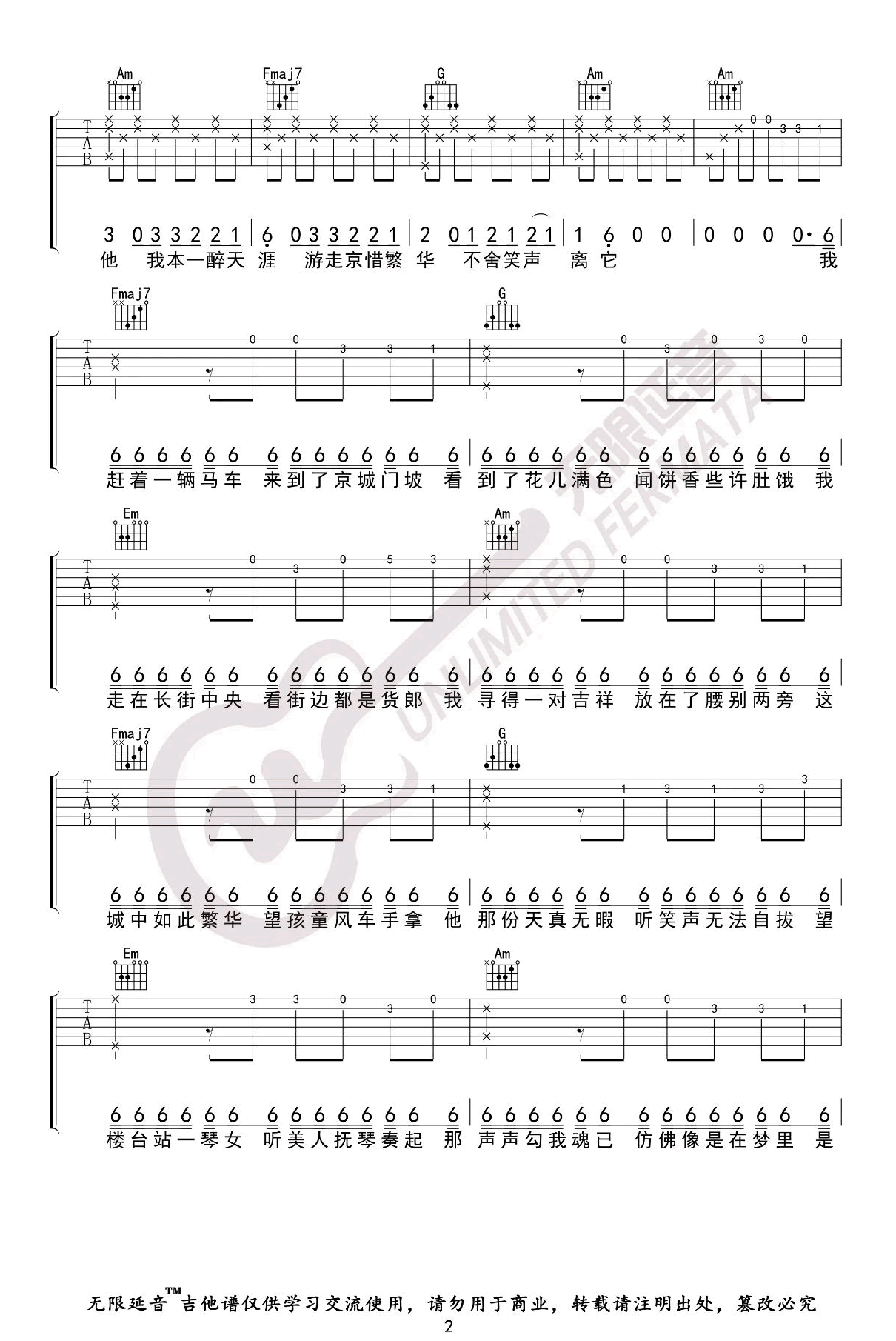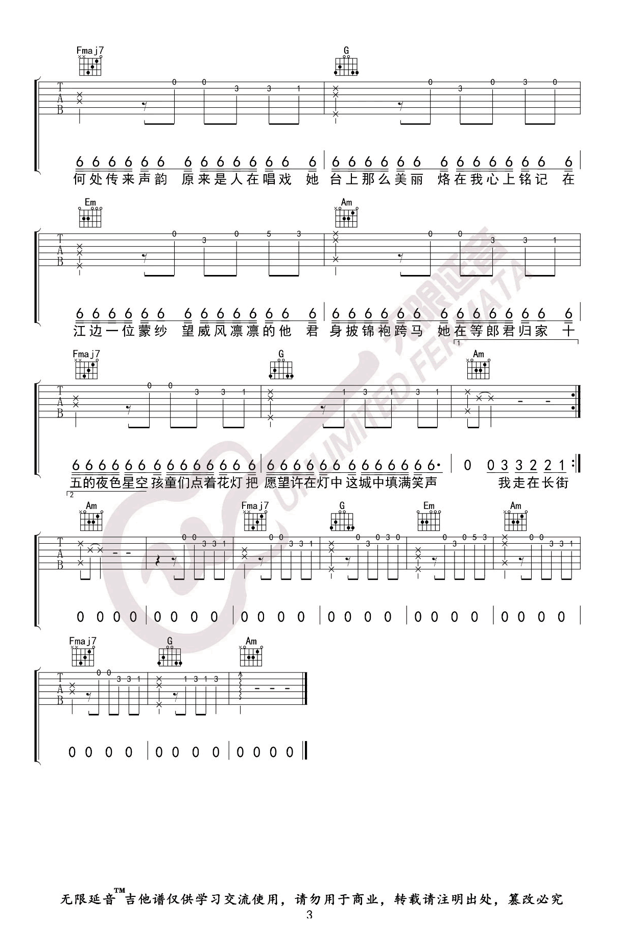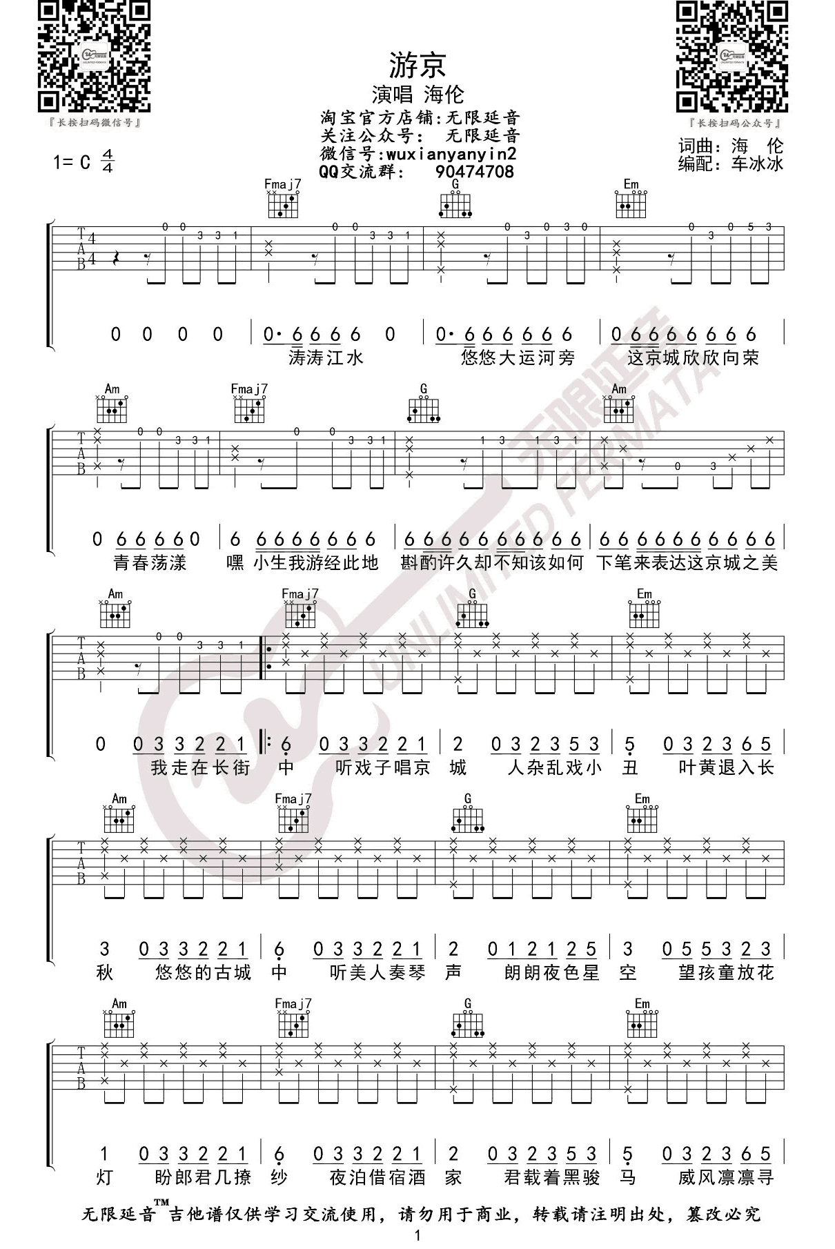 曲谱介绍: 海伦《游京》吉他弹唱谱,采用C调指法编配,共有3张高清图谱。