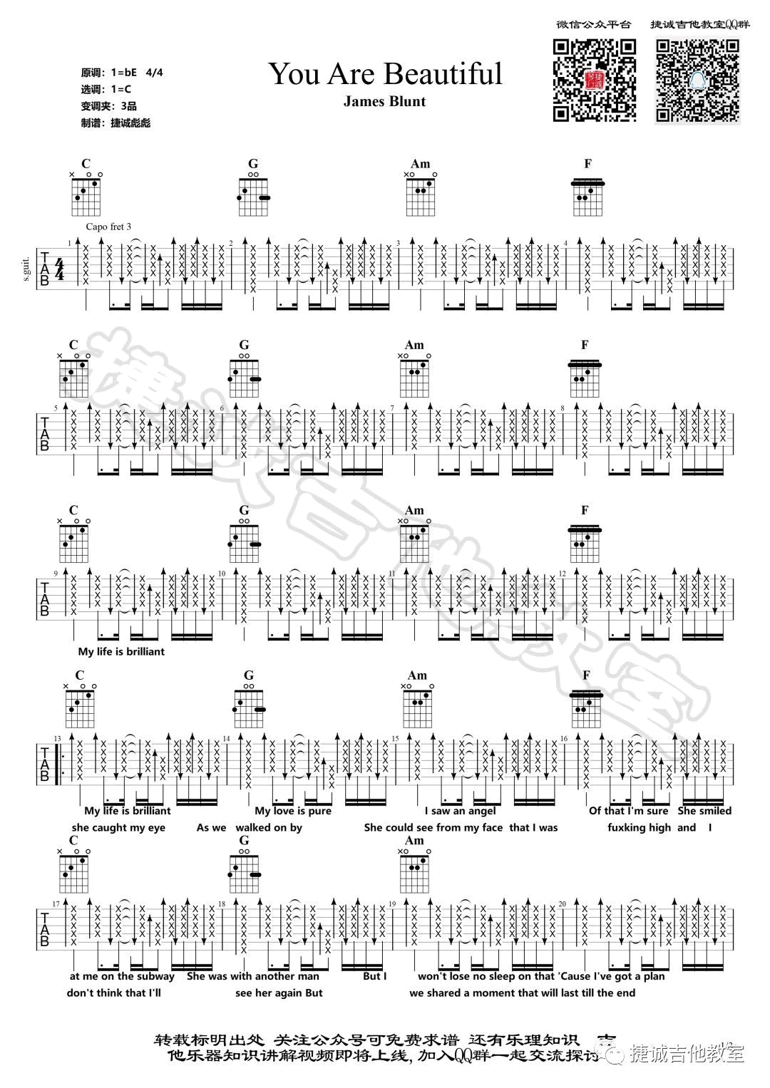 曲谱介绍: James《YouareBeautiful》吉他弹唱谱,采用C调指法编配,共有3张高清图谱。