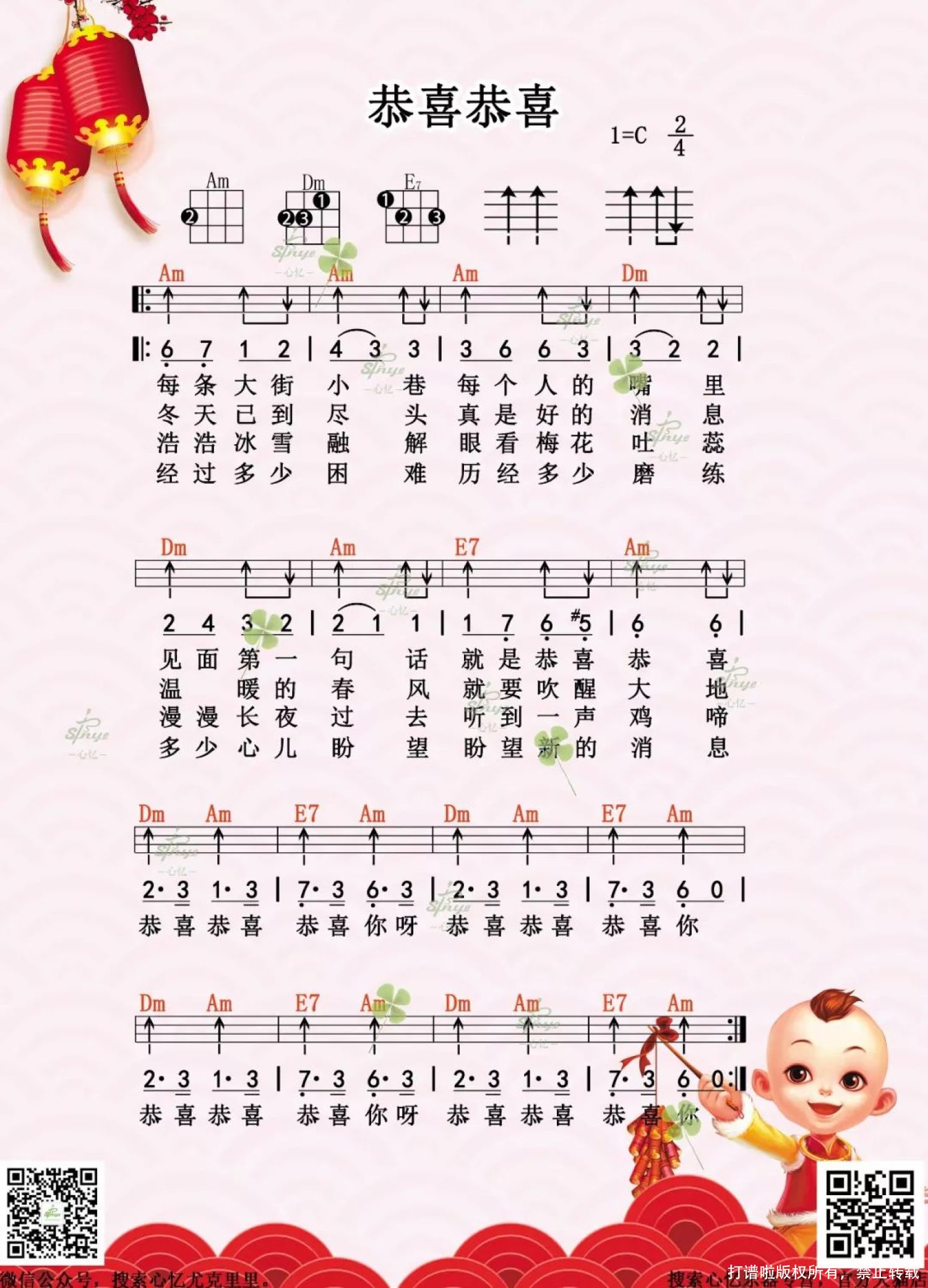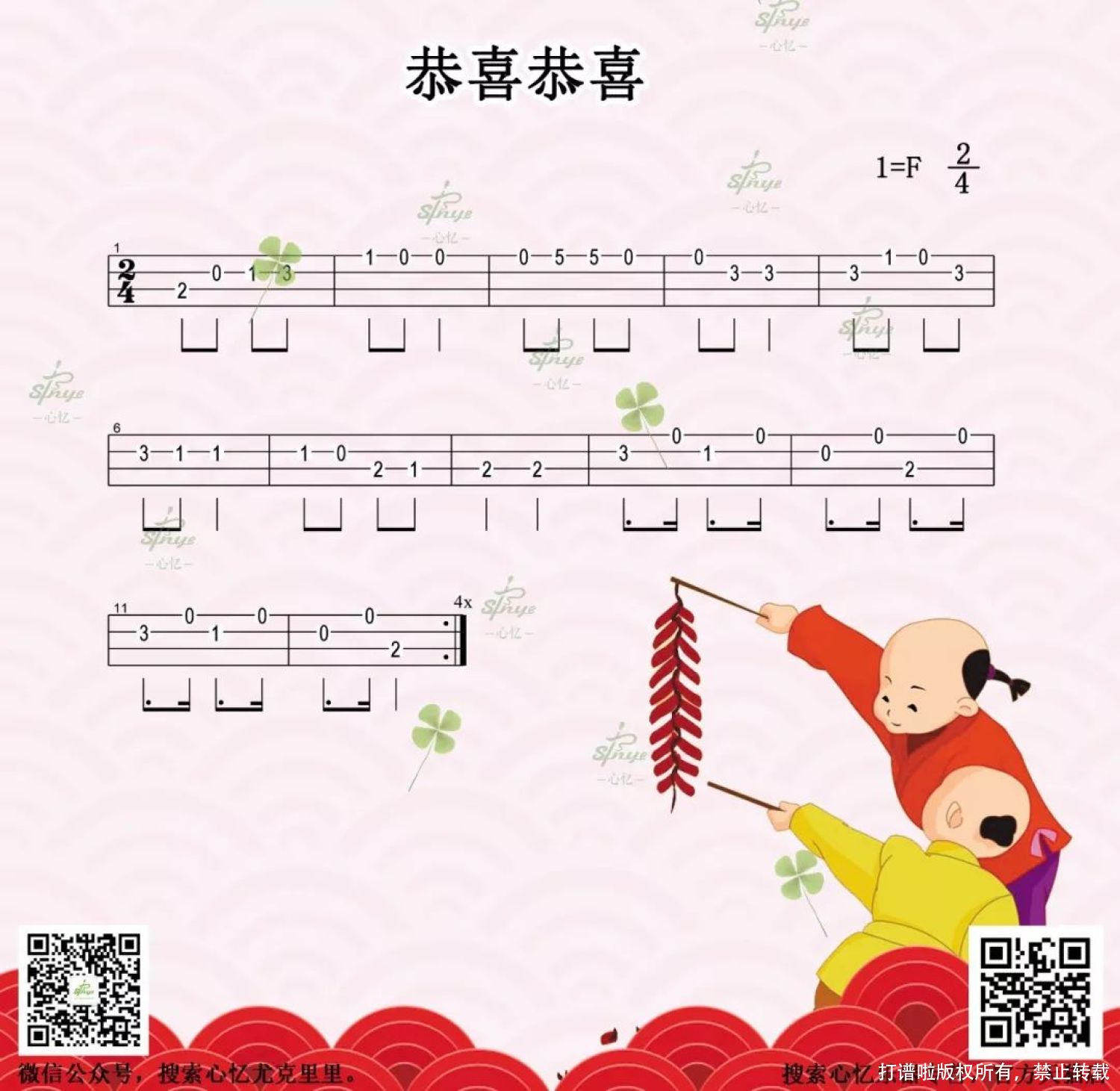 曲谱介绍: 《恭喜恭喜》尤克里里简单指弹谱   弹唱谱
