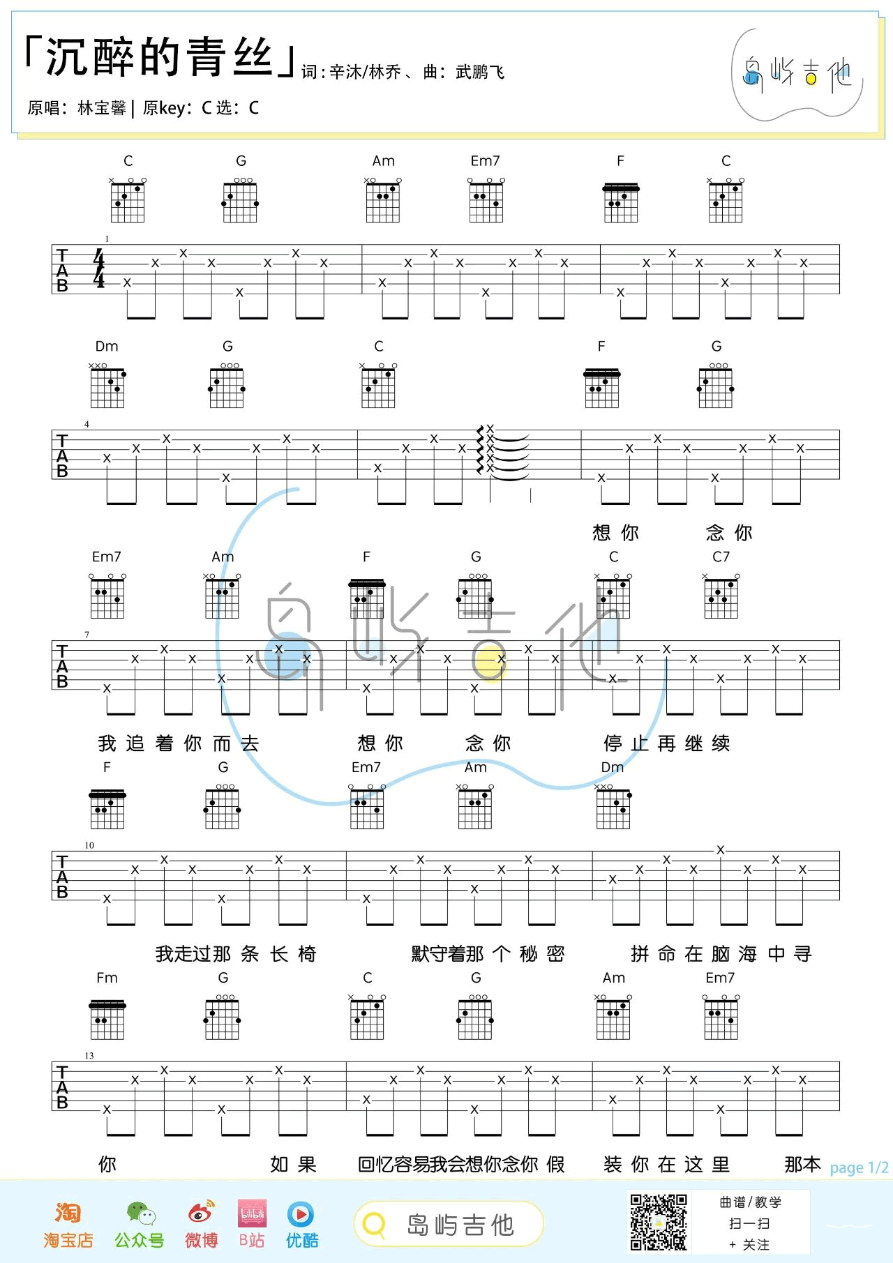 曲谱介绍: 林宝馨《沉醉的青丝》吉他弹唱谱,采用C调指法编配,共有2张高清图谱,免翻页排版设计。