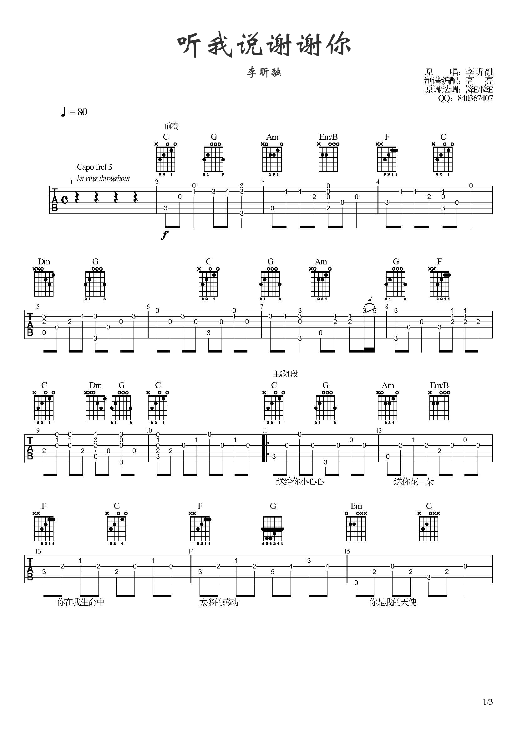 曲谱介绍: 李昕融《听我说谢谢你》吉他弹唱谱,采用C调指法编配,共有3张高清图谱。