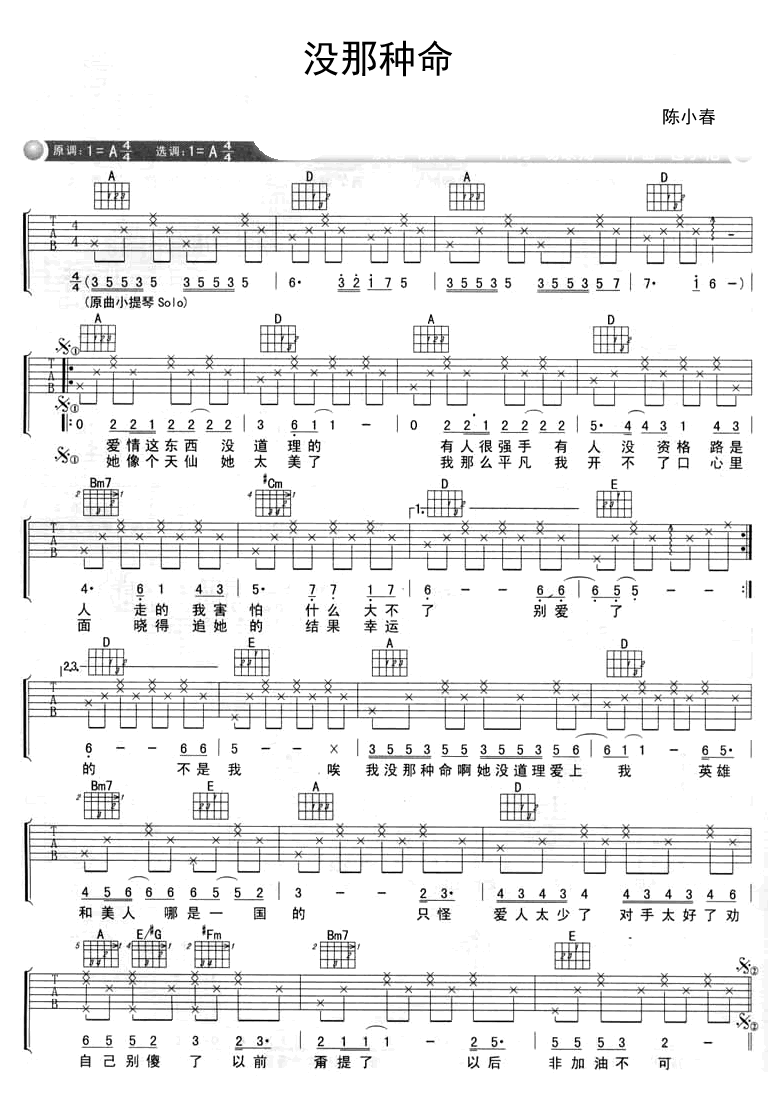 曲谱介绍: 陈小春/GAI周延《没那种命》吉他弹唱谱,采用A调指法编配,共有2张高清图谱,免翻页排版设计。
