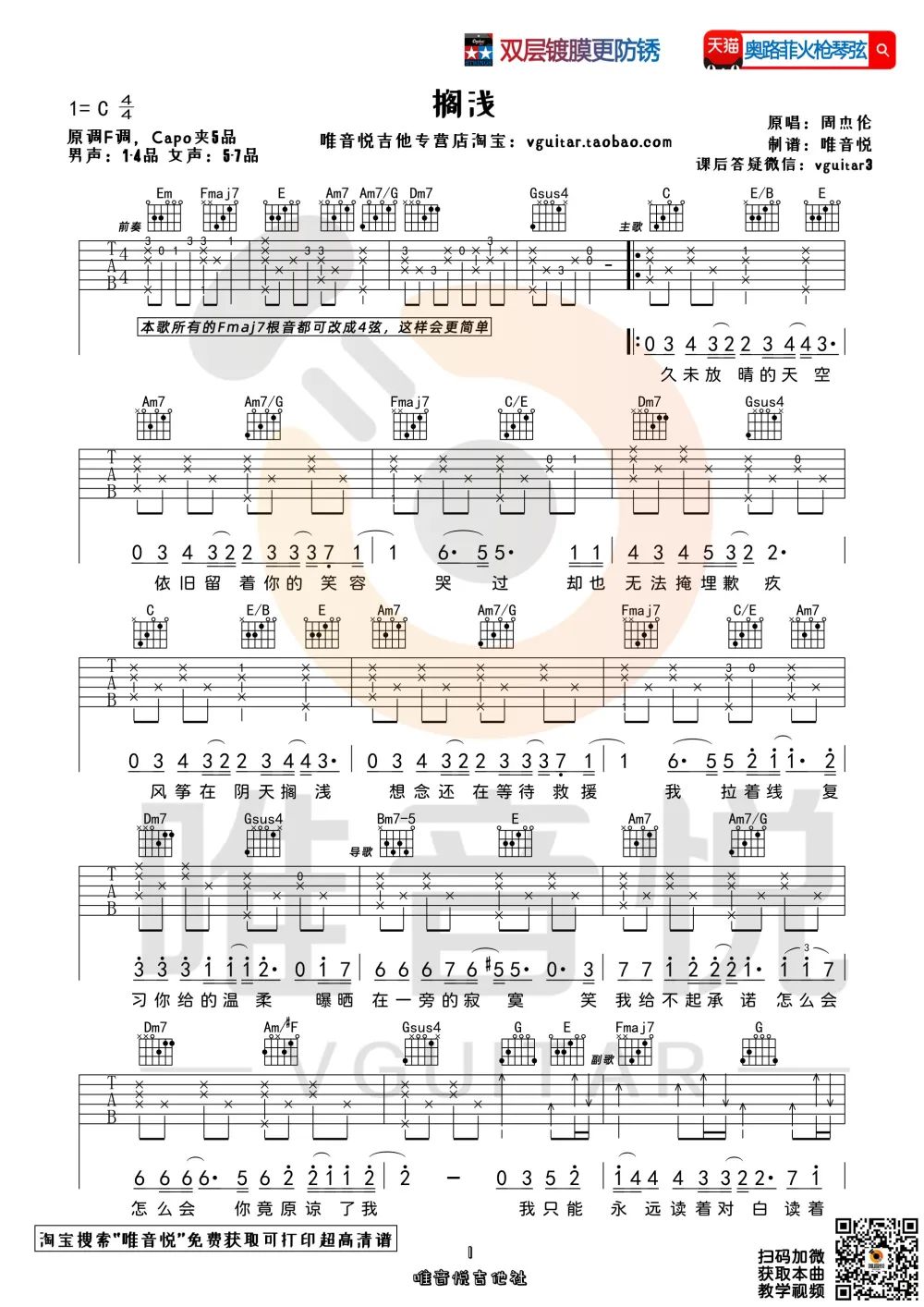 曲谱介绍: 周杰伦《搁浅》吉他弹唱谱,采用C调指法编配原版,共有2张高清图谱,免翻页排版设计。