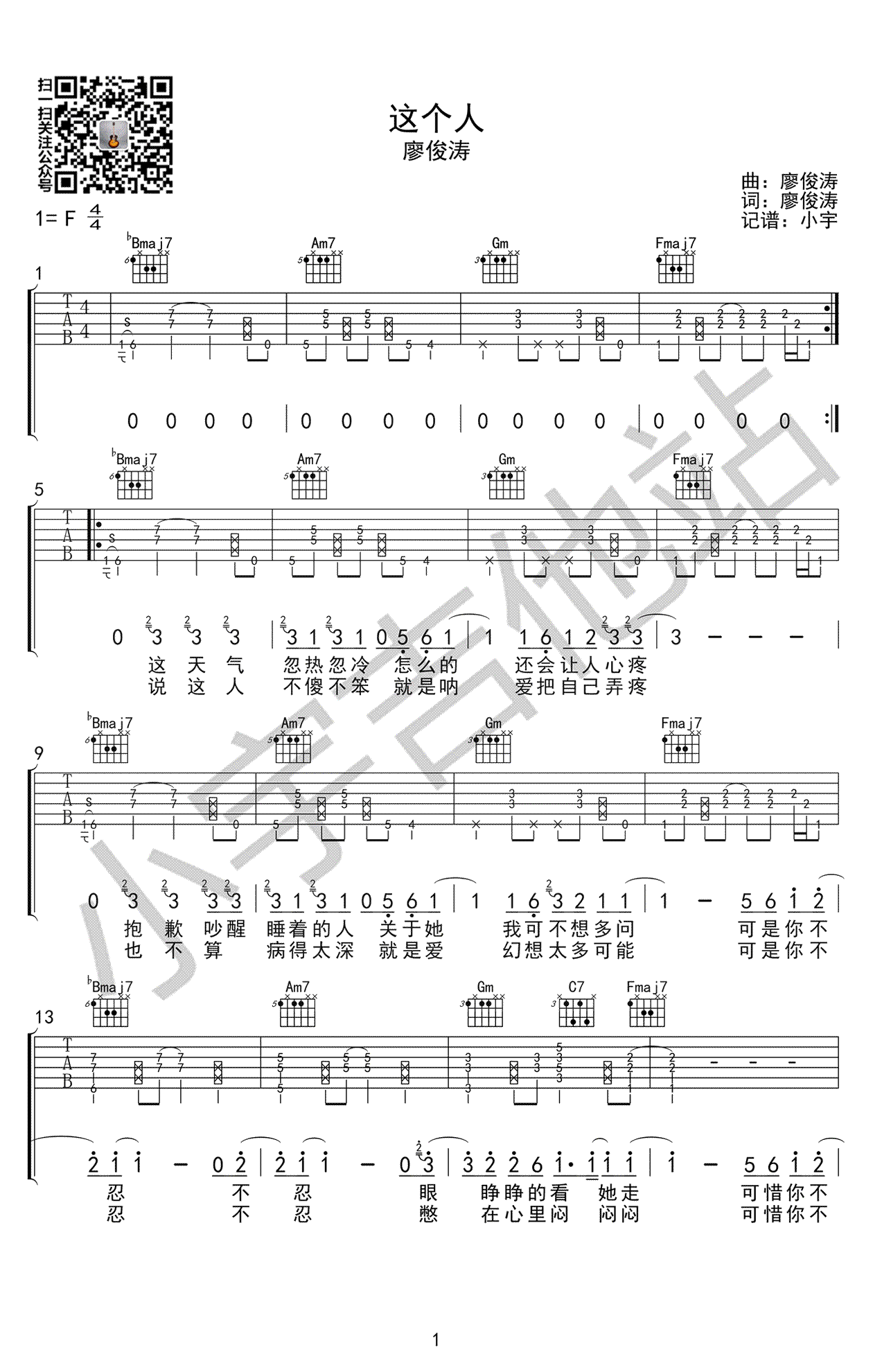 曲谱介绍: 廖俊涛《这个人》吉他弹唱谱,采用F调指法编配原版,共有3张高清图谱。