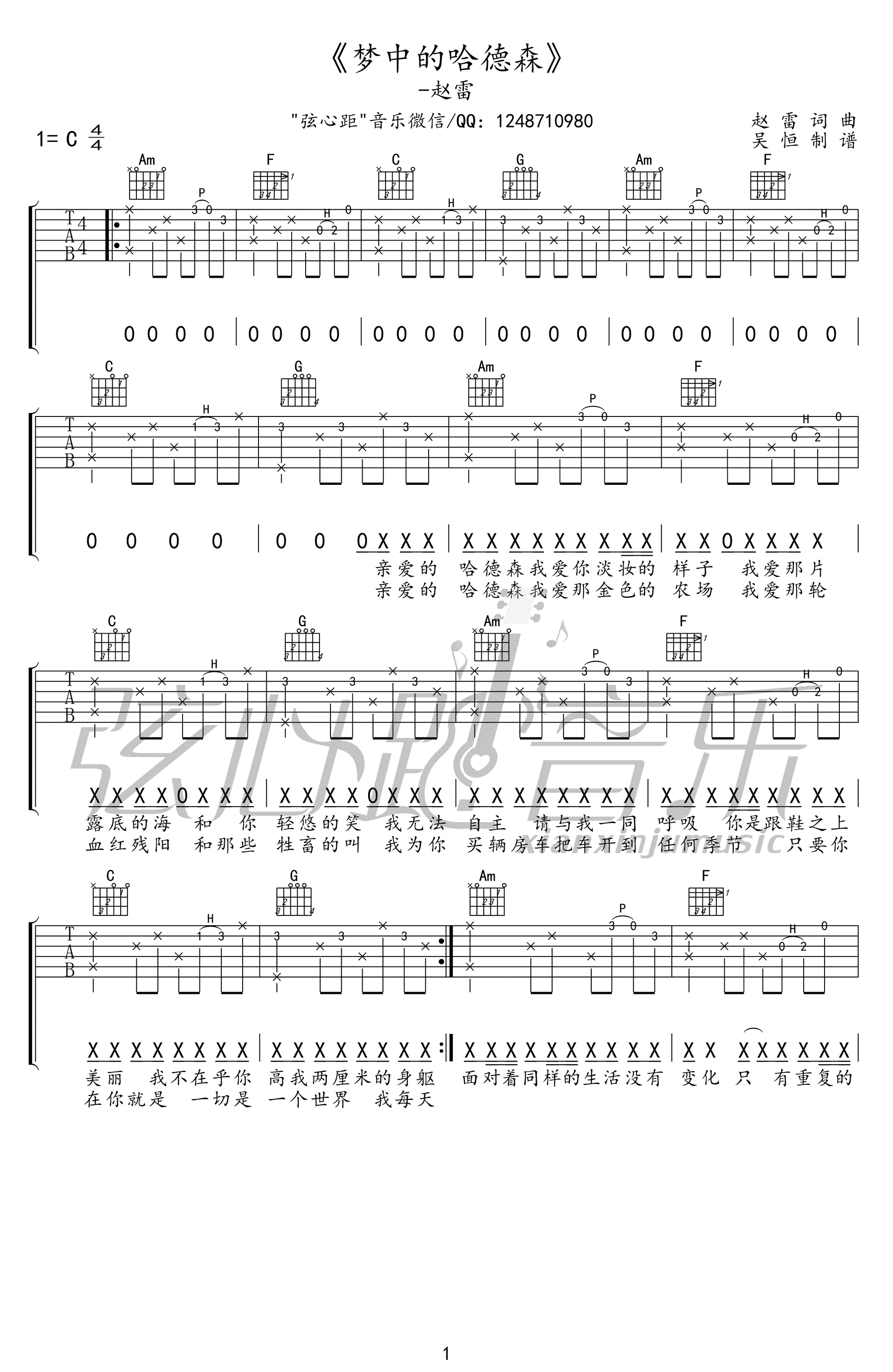 曲谱介绍: 赵雷《梦中的哈德森》吉他弹唱谱,采用C调指法编配,共有2张高清图谱,免翻页排版设计。