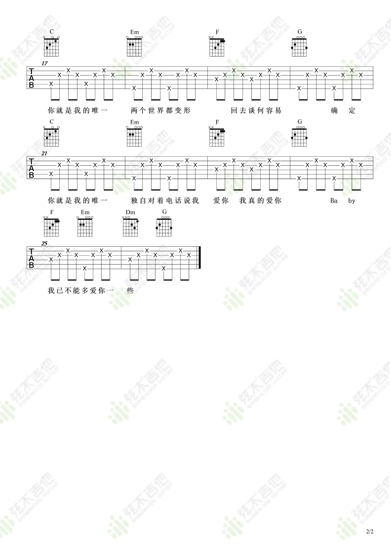 曲谱介绍: 王力宏《唯一》吉他弹唱谱,采用C调指法编配,共有2张高清图谱,免翻页排版设计。