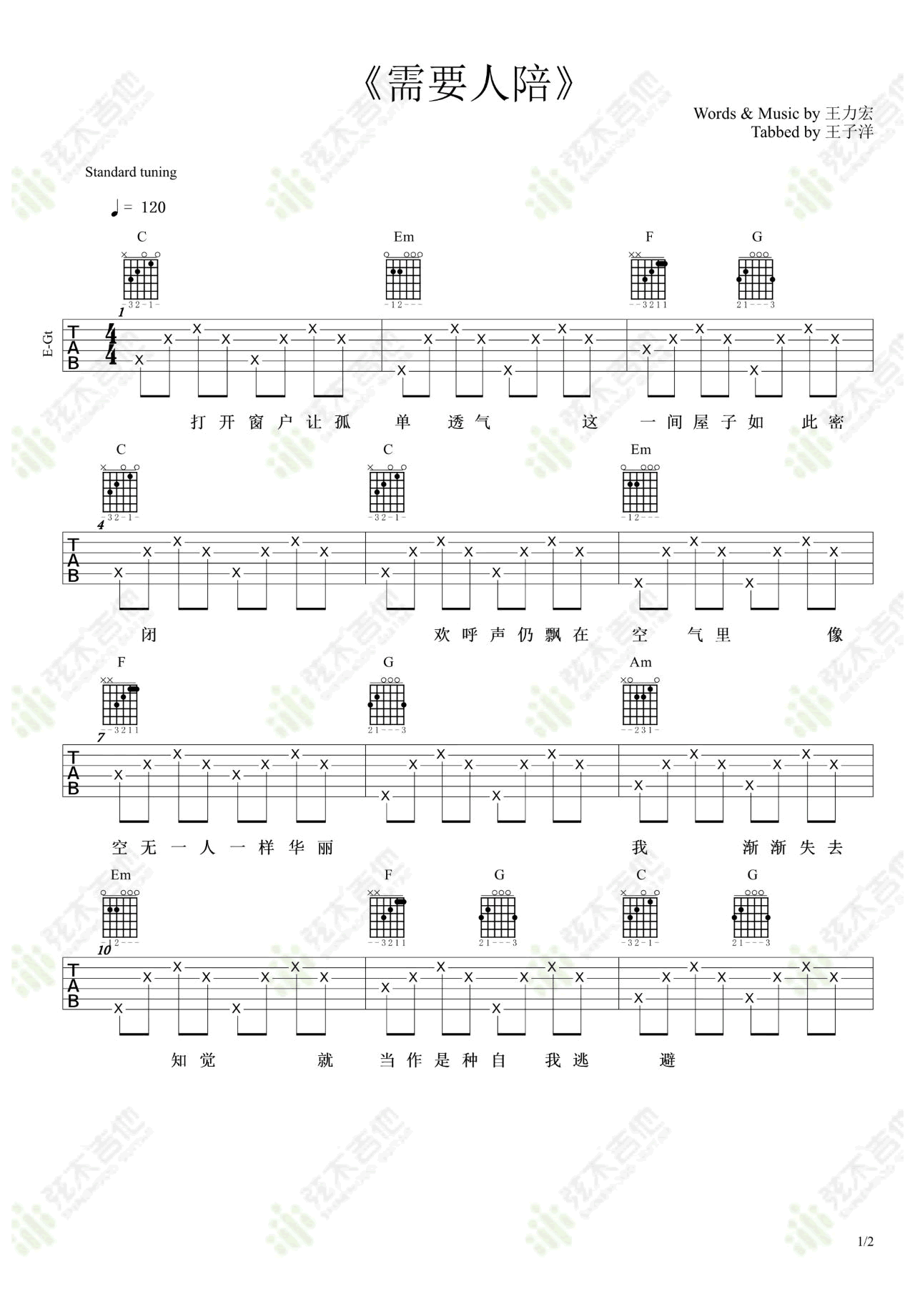 需要人陪吉他谱 - 王力宏 - C调吉他弹唱谱
