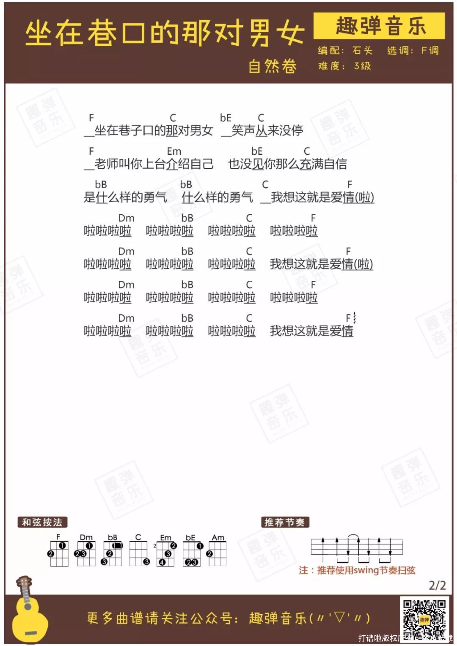 曲谱介绍: 《坐在巷口的那对男女》乌克丽丽谱 第一次听到这首歌,就觉得它与小U一定超级般配。棉花糖一样弹性十足的节奏,俏皮可爱的旋律,总让人联想到一个蹦蹦跳跳的小女孩,是不少人的减压必备歌曲。 想不到的是,最开始这首歌是作为玉兰油广告音乐被人熟知的,如果你看过那条广告,你的年龄已经被暴露了。 「坐在巷口的那对男女」运用诙谐轻松的方式调侃了小情侣之间笨笨甜甜的相处模式,逗趣可爱,让人不禁莞尔。 恋爱的日常就是歌里这些细碎简单的琐事拼凑在一起,两个人在一起的时候,就连做幼稚傻事都觉得甜蜜。 这首歌活泼俏皮的旋律,简直就是为小U而生~一起弹唱这首简单又好听的小曲儿吧♪