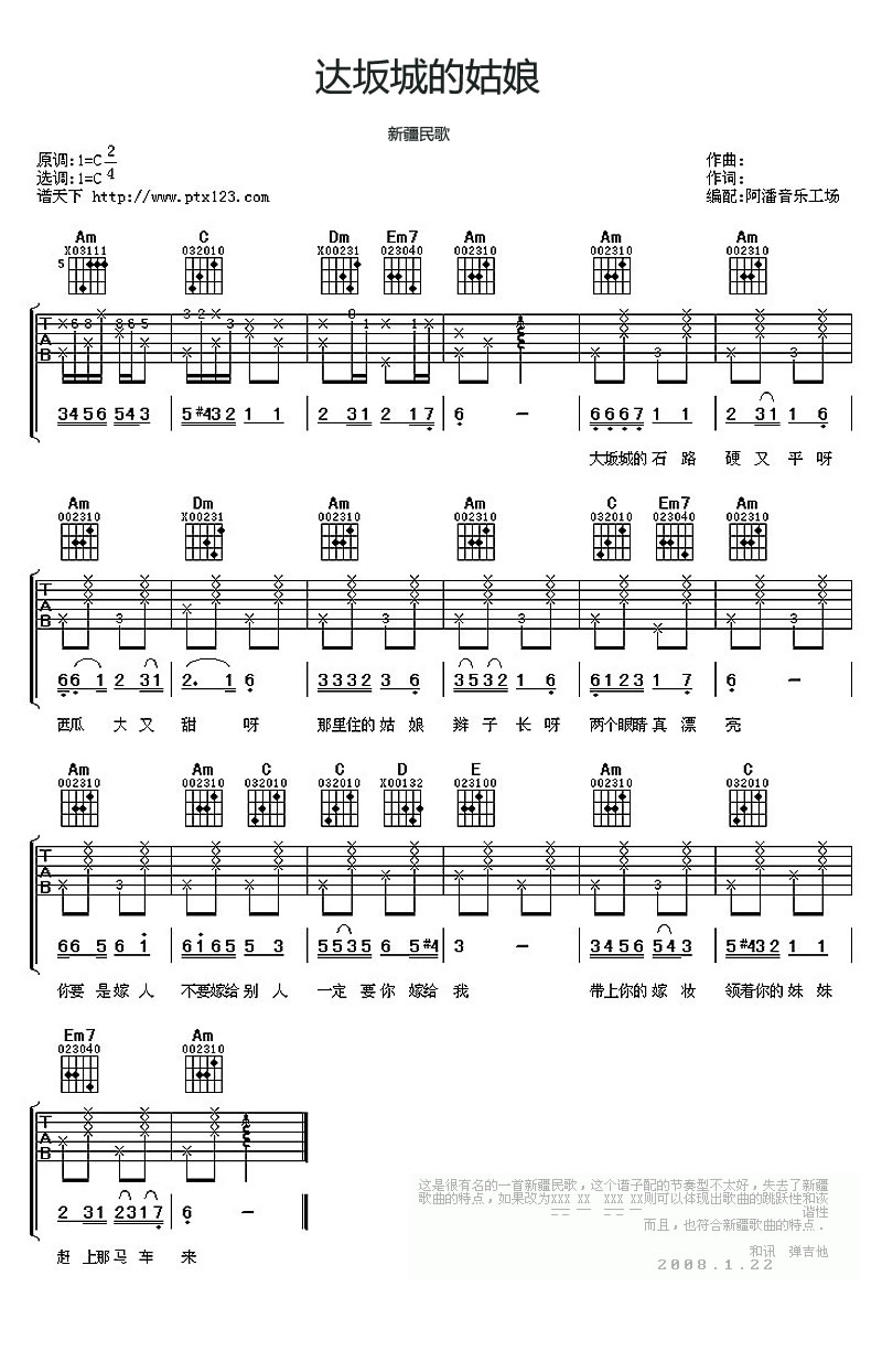 曲谱介绍: 新疆民歌《达坂城的姑娘》吉他弹唱谱,采用C调指法编配,共有1张高清图谱,免翻页排版设计。