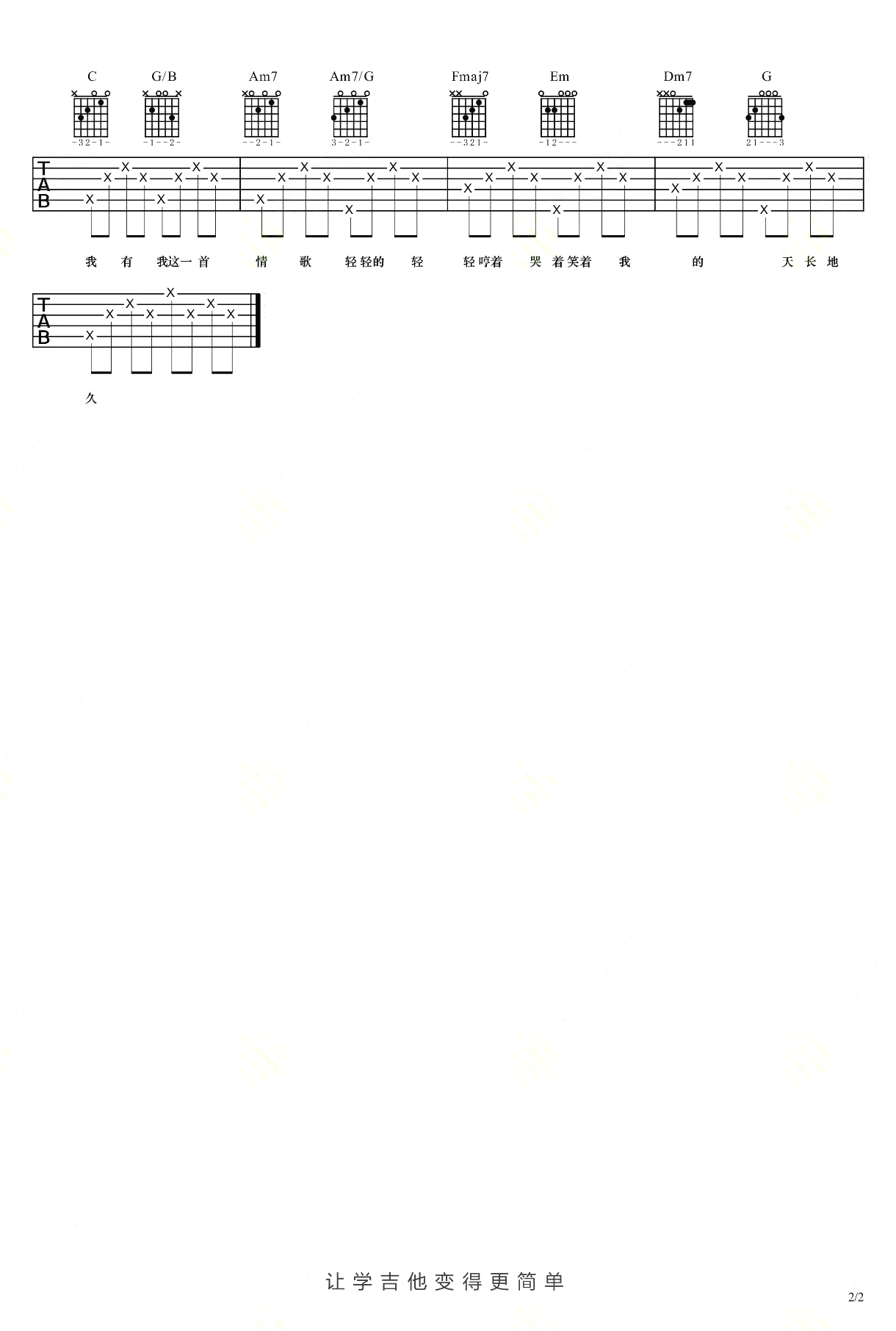 曲谱介绍: 梁静茹《情歌》吉他弹唱谱,采用C调指法编配,共有2张高清图谱,免翻页排版设计。