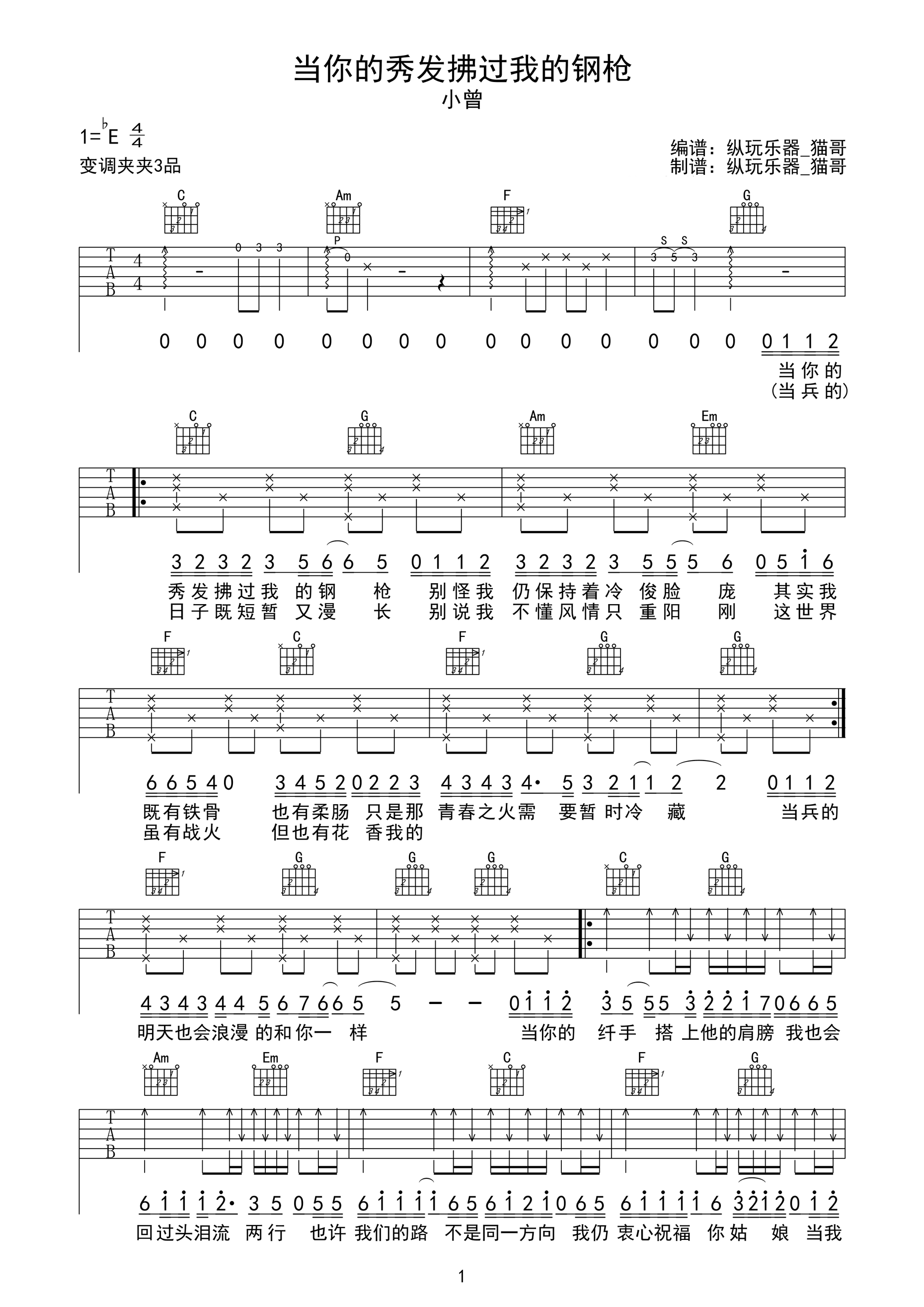 曲谱介绍: 小曾《当你的秀发拂过我的钢枪》吉他弹唱谱,采用C调指法编配,共有2张高清图谱,免翻页排版设计。