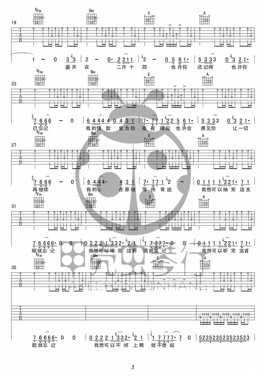 曲谱介绍: 深蓝乐队《二月十四》吉他弹唱谱,采用A调指法编配,共有4张高清图谱。