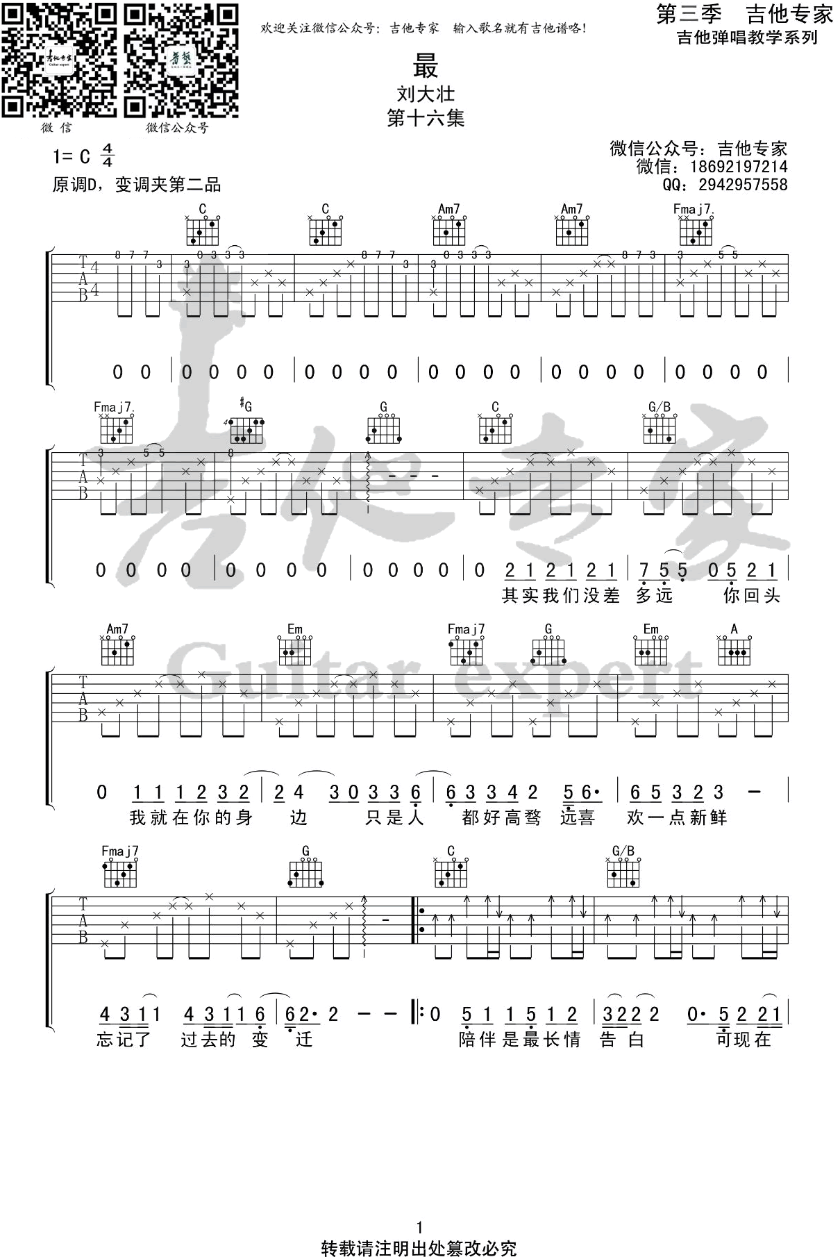 曲谱介绍: 刘大壮《最》吉他弹唱谱,采用C调指法编配,共有4张高清图谱。