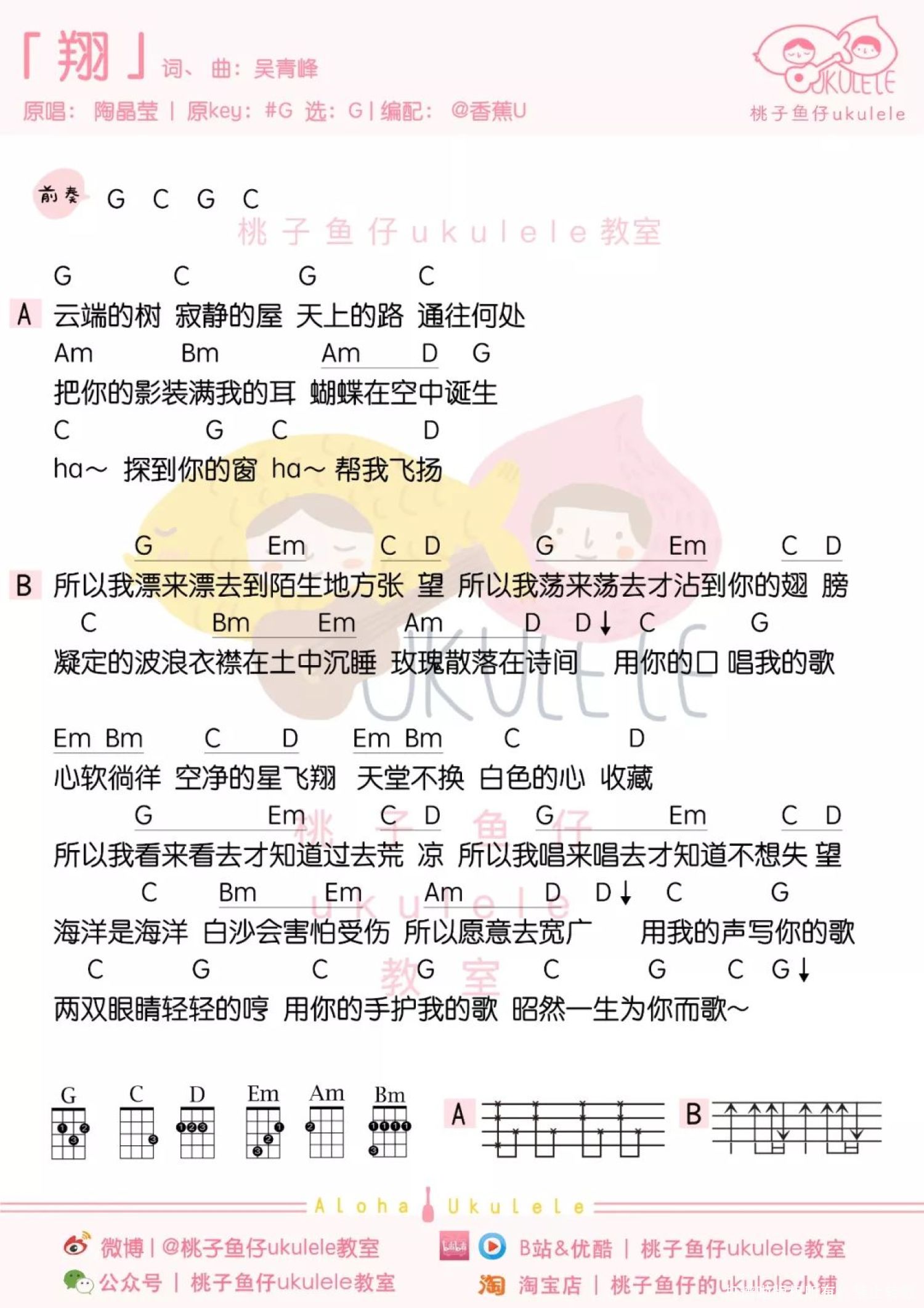 曲谱介绍: 《翔》尤克里里谱 @吳青峰: 今天用〈翔〉這首溫暖的歌來迎接美好的三月,翔就是飛翔的翔,不是別的意思,你們不准偷笑這個歌名!不要欺負我的小孩!!畢竟這是我十五年前寫的歌,那時候翔這個字還沒有別的意思!!也謝謝後來陶子姊唱了這首歌。錄音的時候也是風聲不斷,當時我們兩幾乎聽不到對方聲音,請大家隨性聽聽吧。祝三月好!