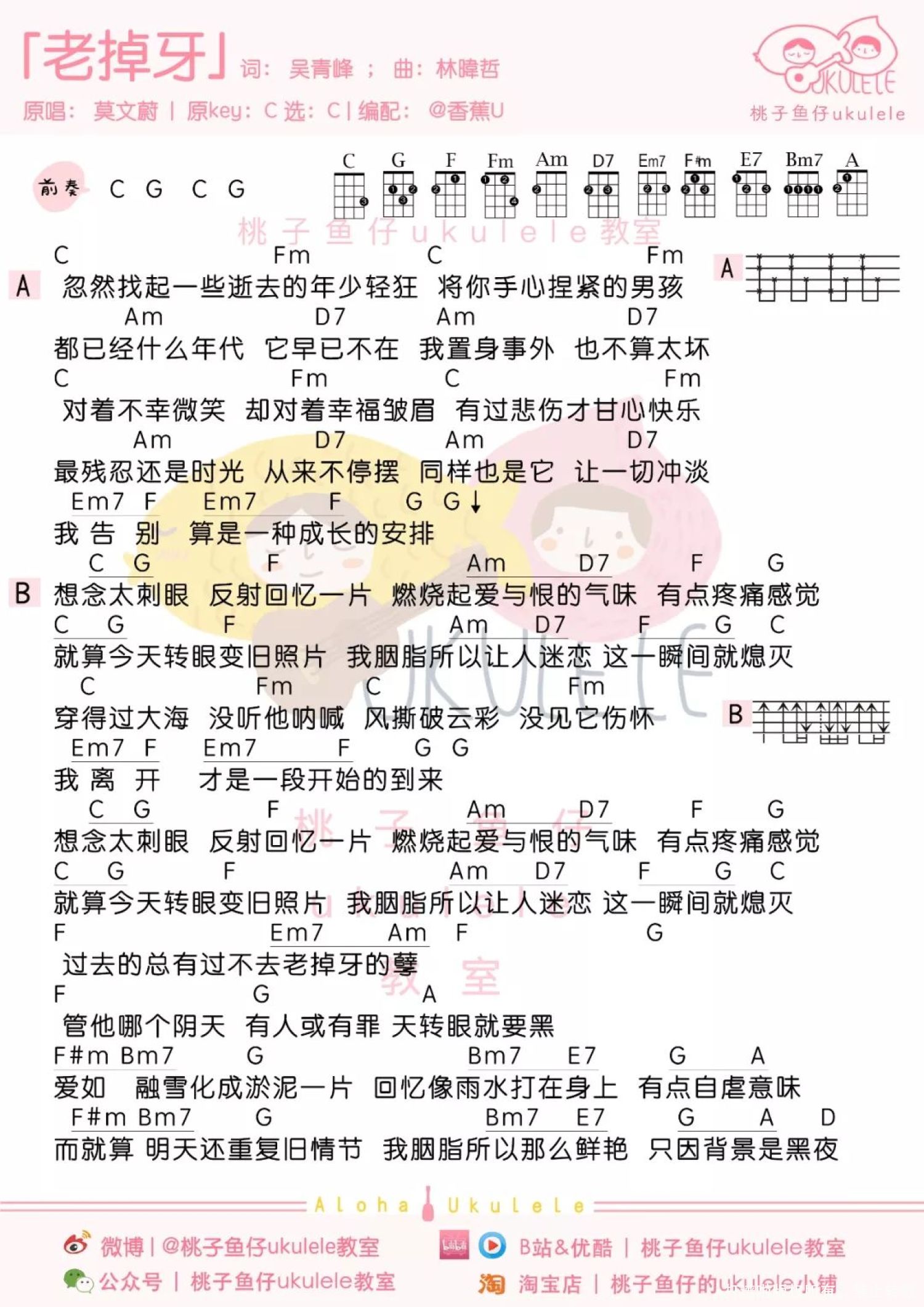 曲谱介绍: 《老掉牙》尤克里里谱 @吳青峰: 很久沒放影片了,其實在冰島錄的還有好多歌沒放,太懶了哈哈。相信放完年假開工,大家都感到開(nán)心(guò)。這是寫給莫文蔚的歌曲,寫的是對於逝去的感情,事過境遷的感慨,送給大家感慨一下逝去的年假。