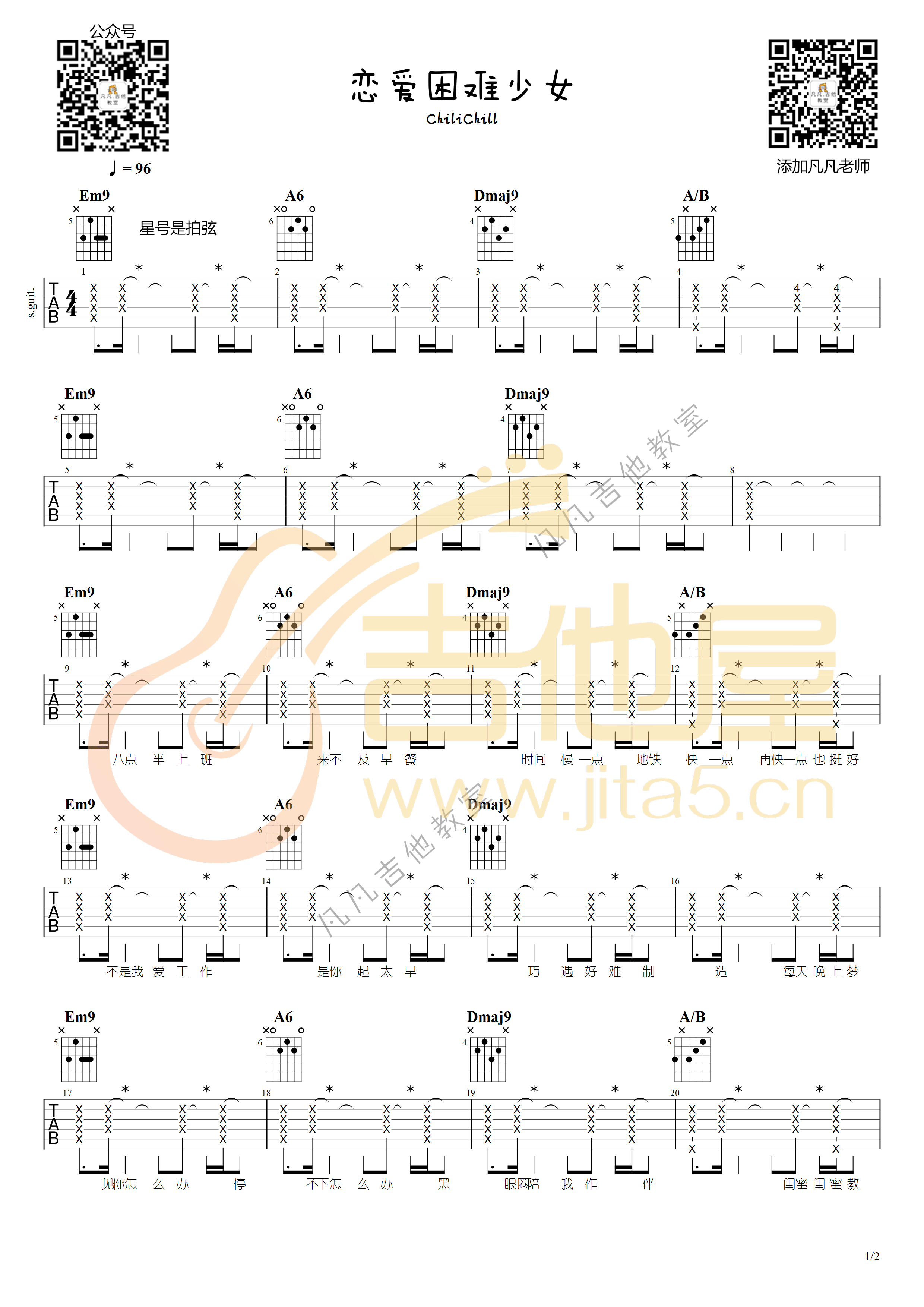 曲谱介绍: ChiliChill《恋爱困难少女》吉他弹唱谱,采用D调指法编配,共有2张高清图谱,免翻页排版设计。