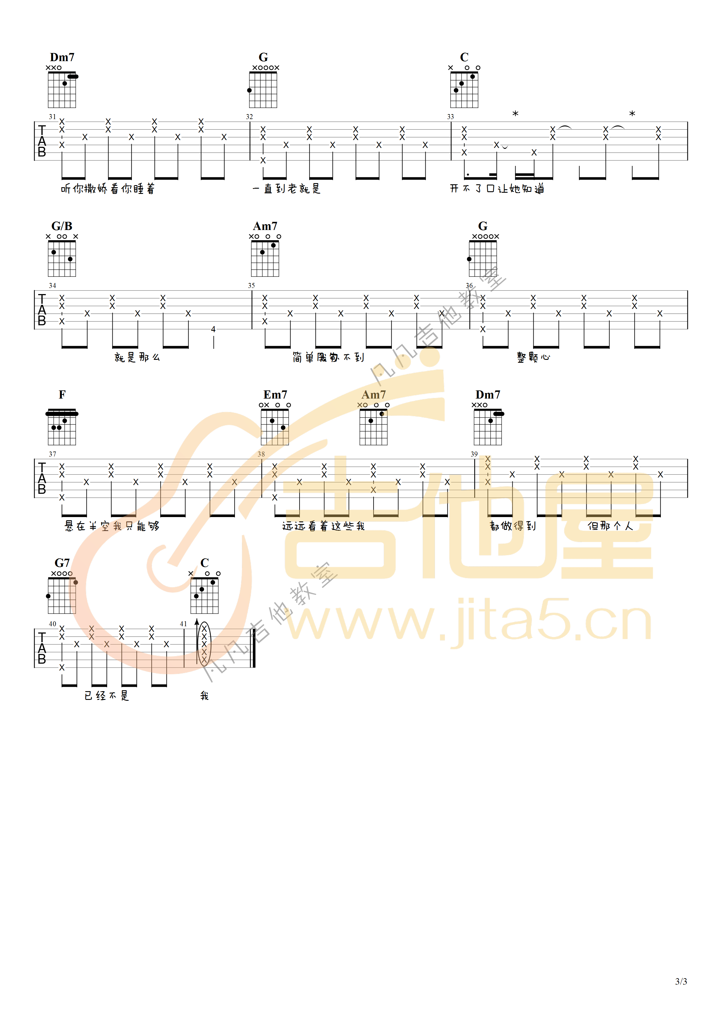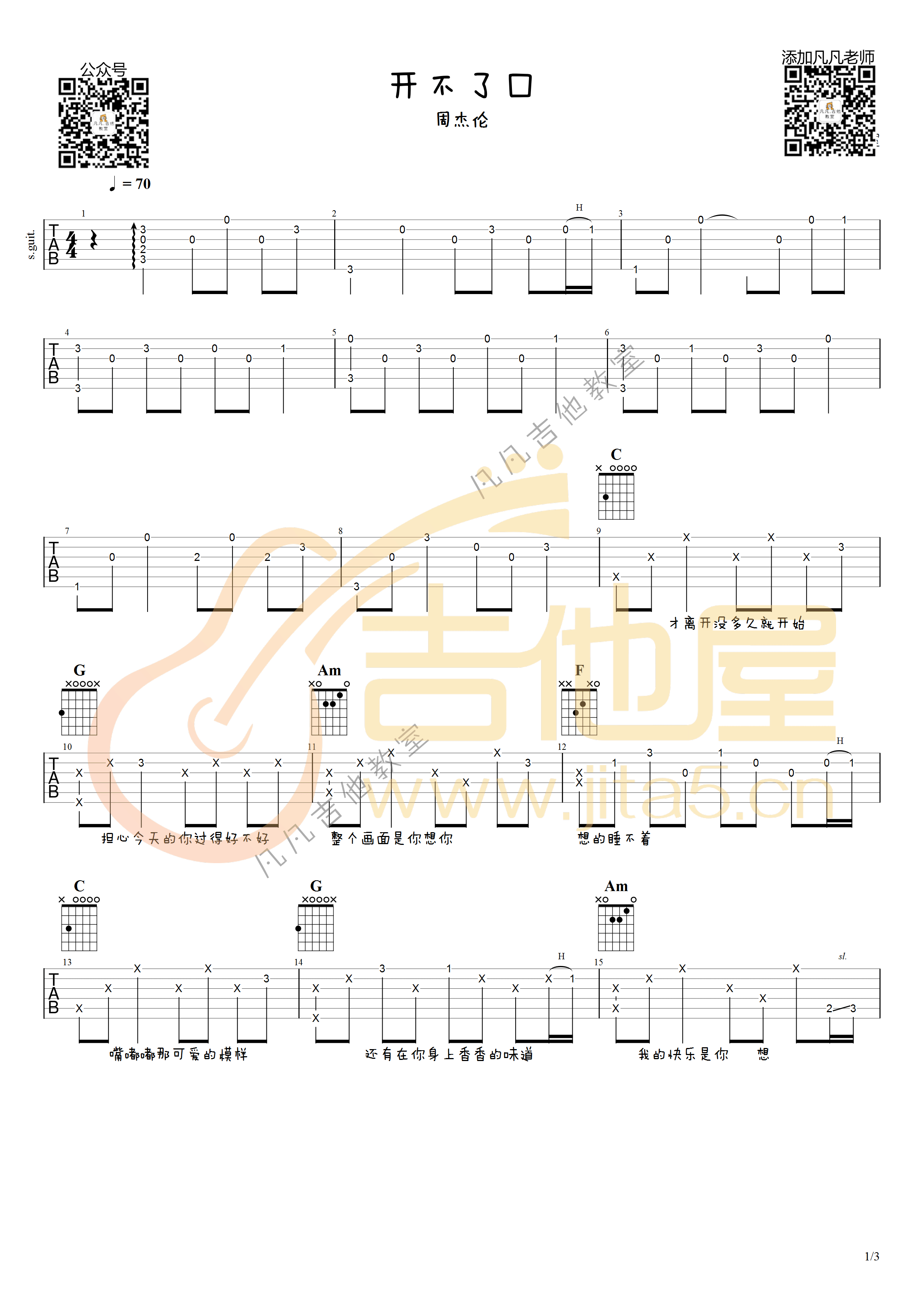 曲谱介绍: 周杰伦《开不了口》吉他弹唱谱,采用C调指法编配原版,共有3张高清图谱。