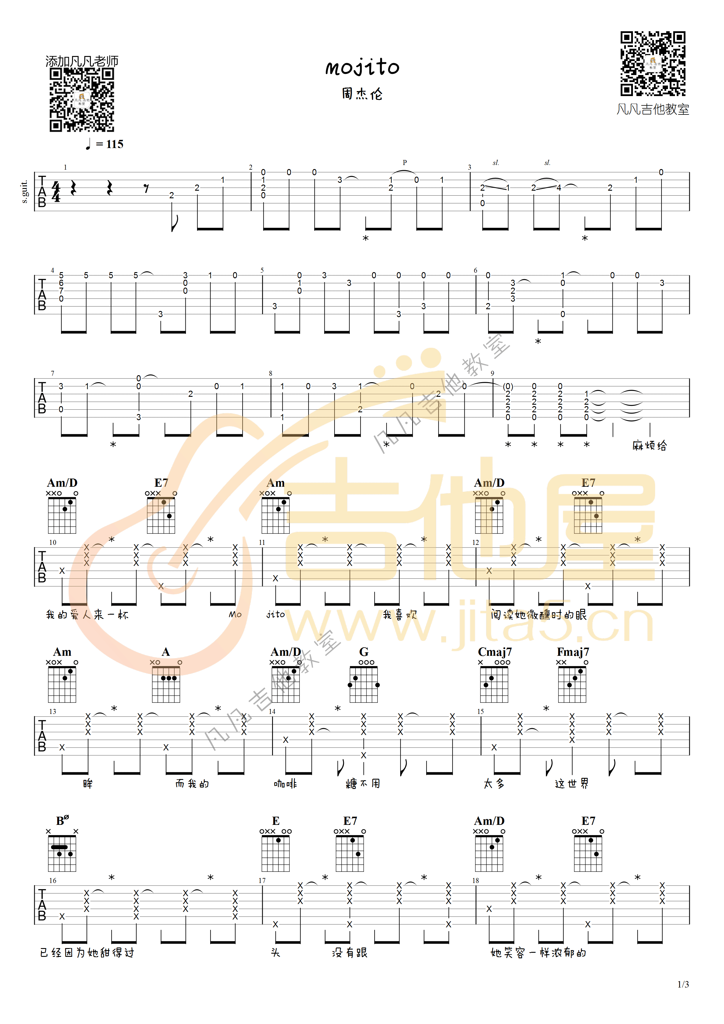 曲谱介绍: 周杰伦《Mojito》吉他弹唱谱,采用C调指法编配,共有3张高清图谱。