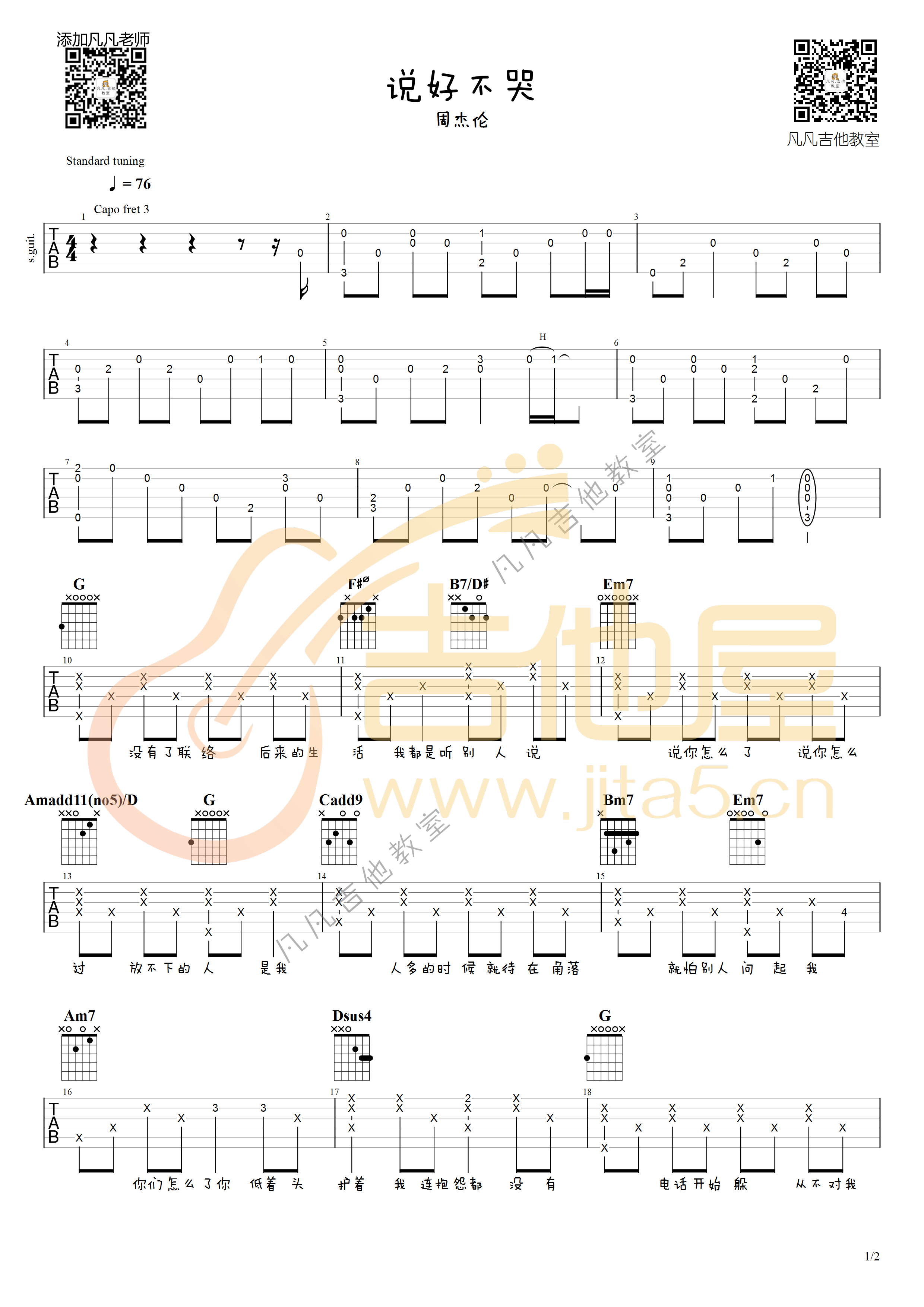 曲谱介绍: 周杰伦《说好不哭》吉他弹唱谱,采用G调指法编配,共有2张高清图谱,免翻页排版设计。