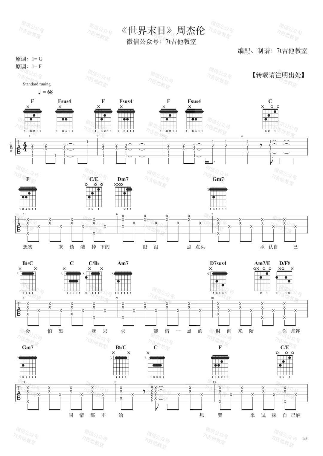 曲谱介绍: 周杰伦《世界末日》吉他弹唱谱,采用F调指法编配,共有3张高清图谱。