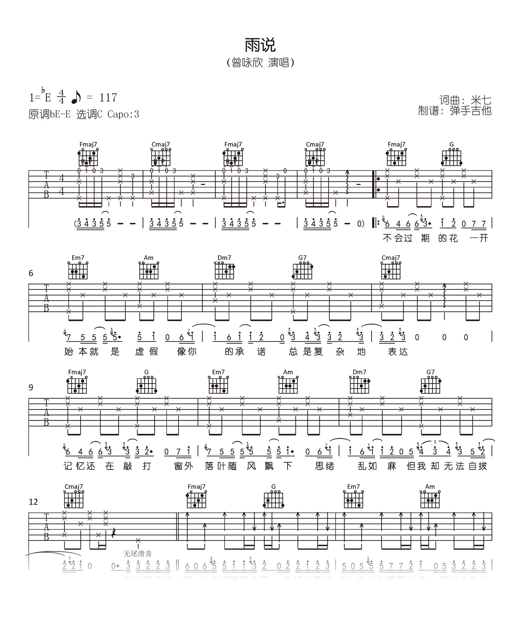 曲谱介绍: 《雨说》吉他弹唱谱,原调bE-E,选调C,CAPO夹三品,完整编配共两张高清图片六线谱。
