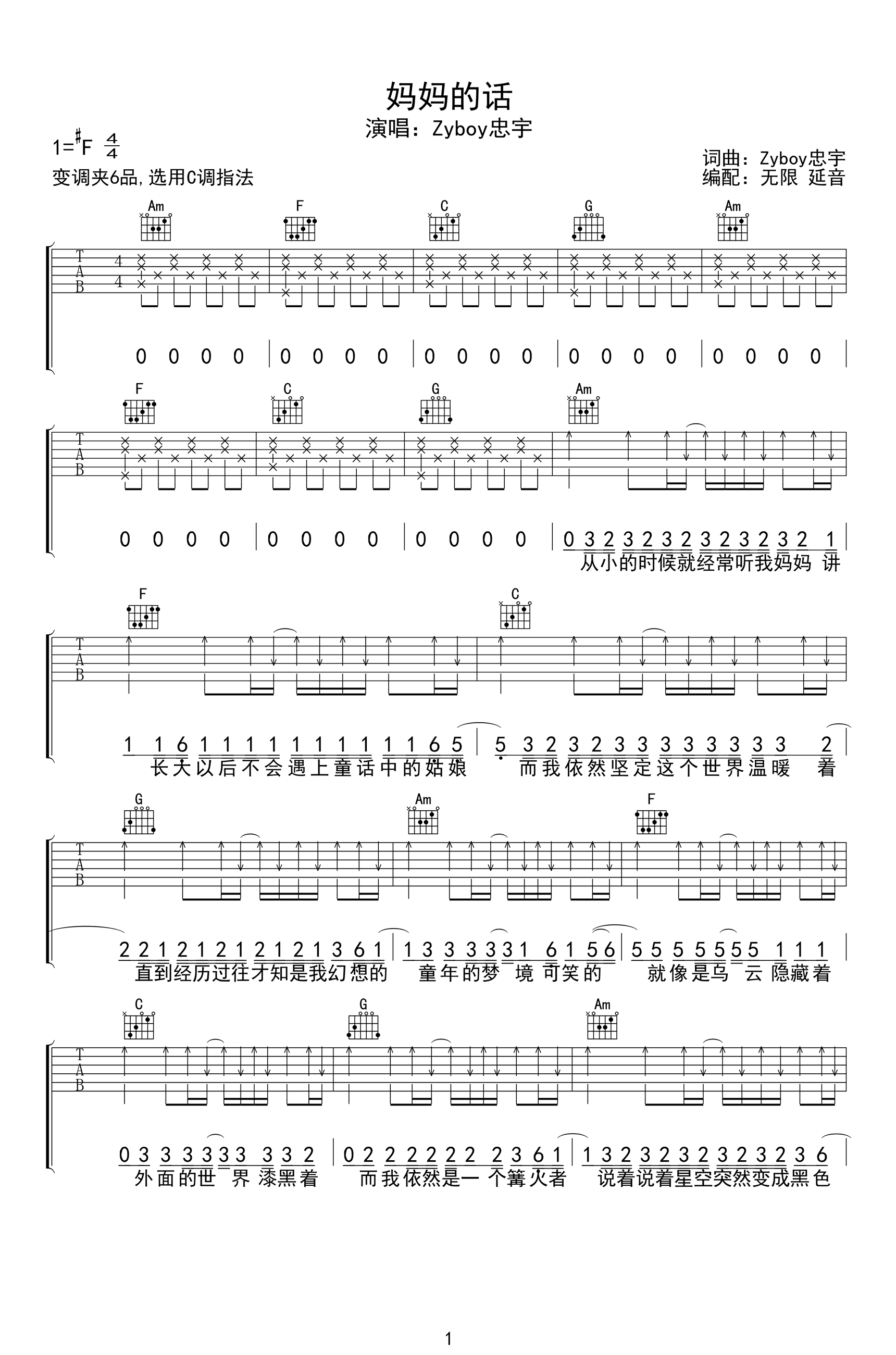 妈妈的话吉他谱 - Zyboy忠宇 - C调吉他弹唱谱