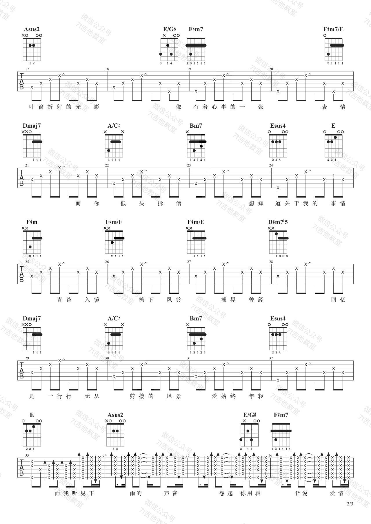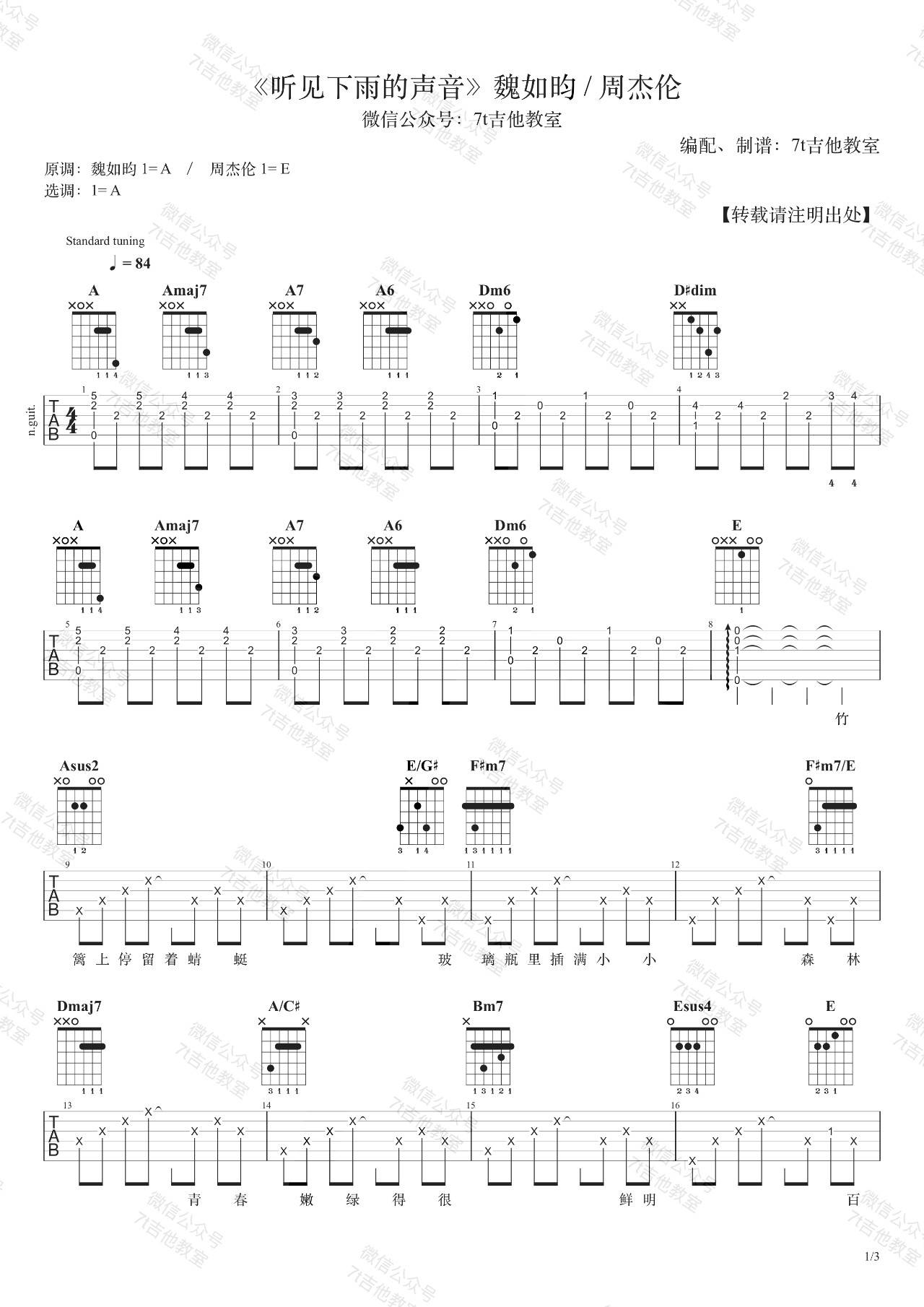 曲谱介绍: 周杰伦/魏如昀《听见下雨的声音》吉他弹唱谱,采用A调指法编配,共有3张高清图谱。