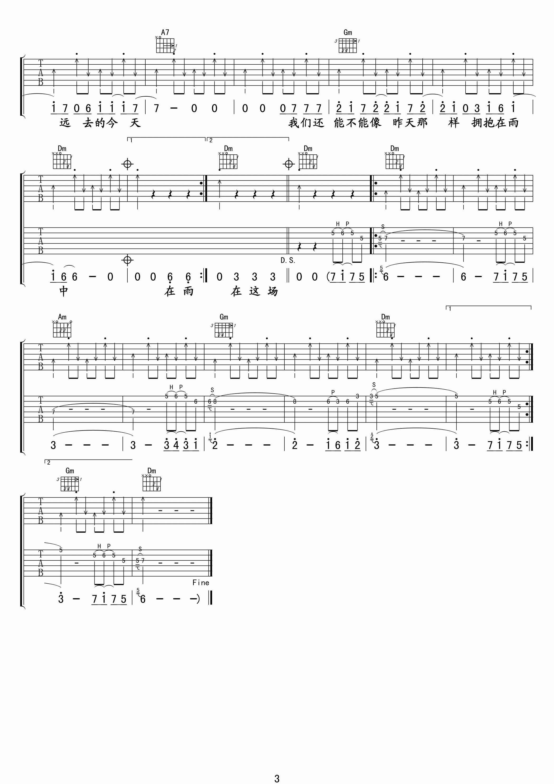 曲谱介绍: 汪峰《在雨中》吉他弹唱谱,采用F调指法编配,共有3张高清图谱。