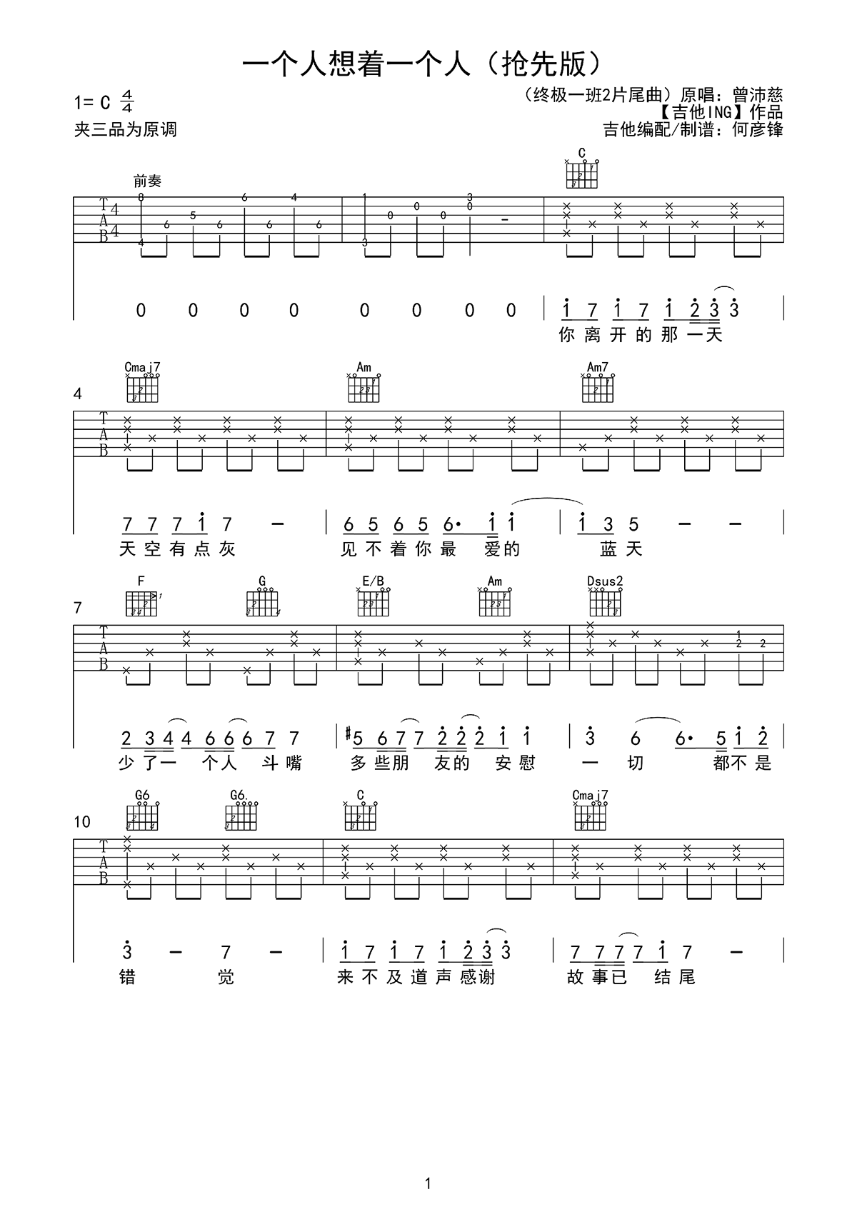 一个人想着一个人吉他谱 - 曾沛慈 - C调吉他弹唱谱 - 原版