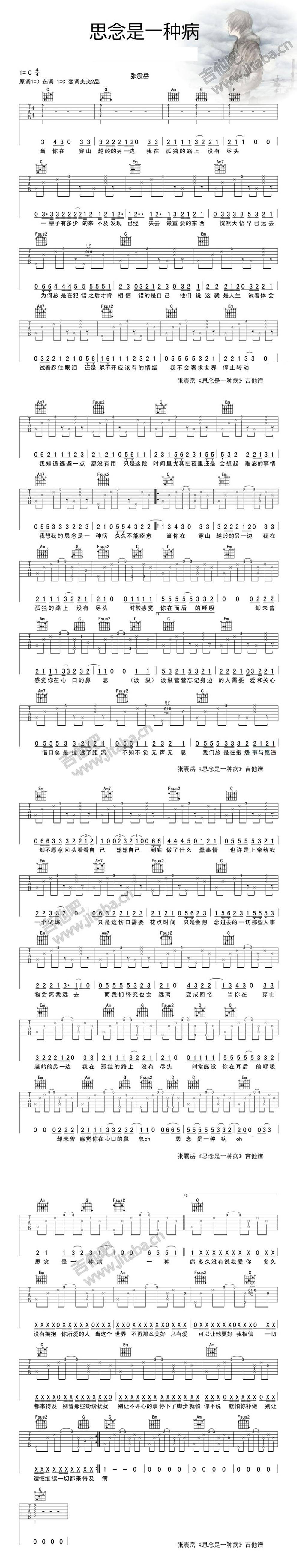 曲谱介绍: 张震岳《思念是一种病》吉他弹唱谱,采用C调指法编配原版,共有1张高清图谱,免翻页排版设计。