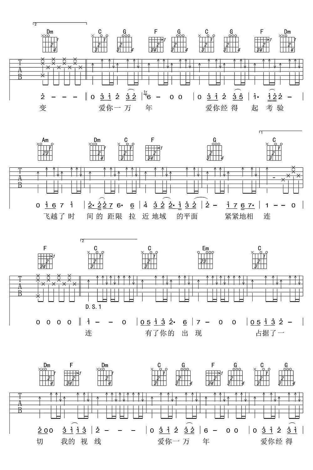 曲谱介绍: 刘德华《爱你一万年》吉他弹唱谱,采用C调指法编配原版,共有3张高清图谱。