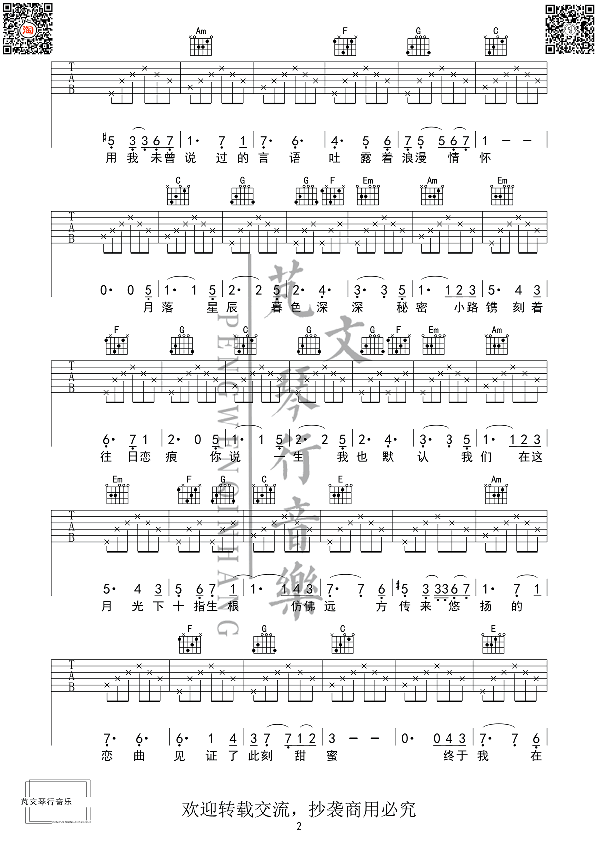 曲谱介绍: 毛不易/刘惜君《芬芳一生》吉他弹唱谱,采用C调指法编配,共有4张高清图谱。