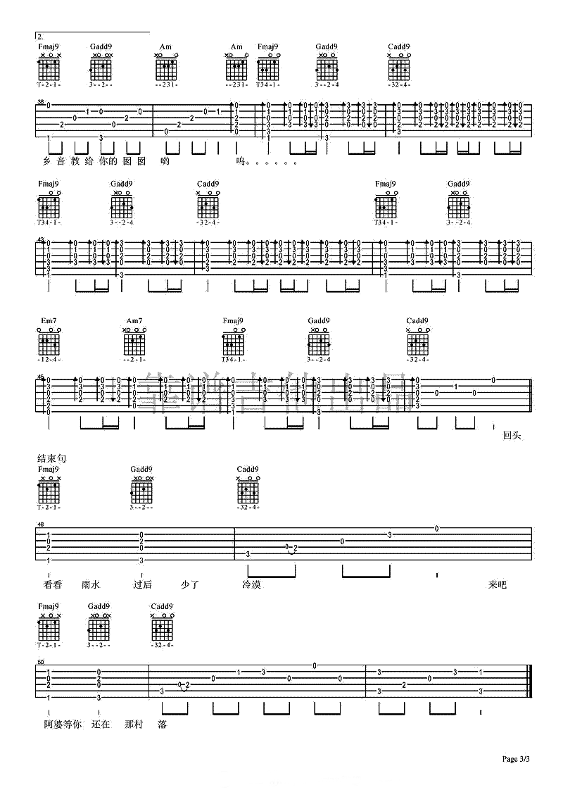 曲谱介绍: 暗杠《阿婆说》吉他弹唱谱,采用C调指法编配原版,共有3张高清图谱。
