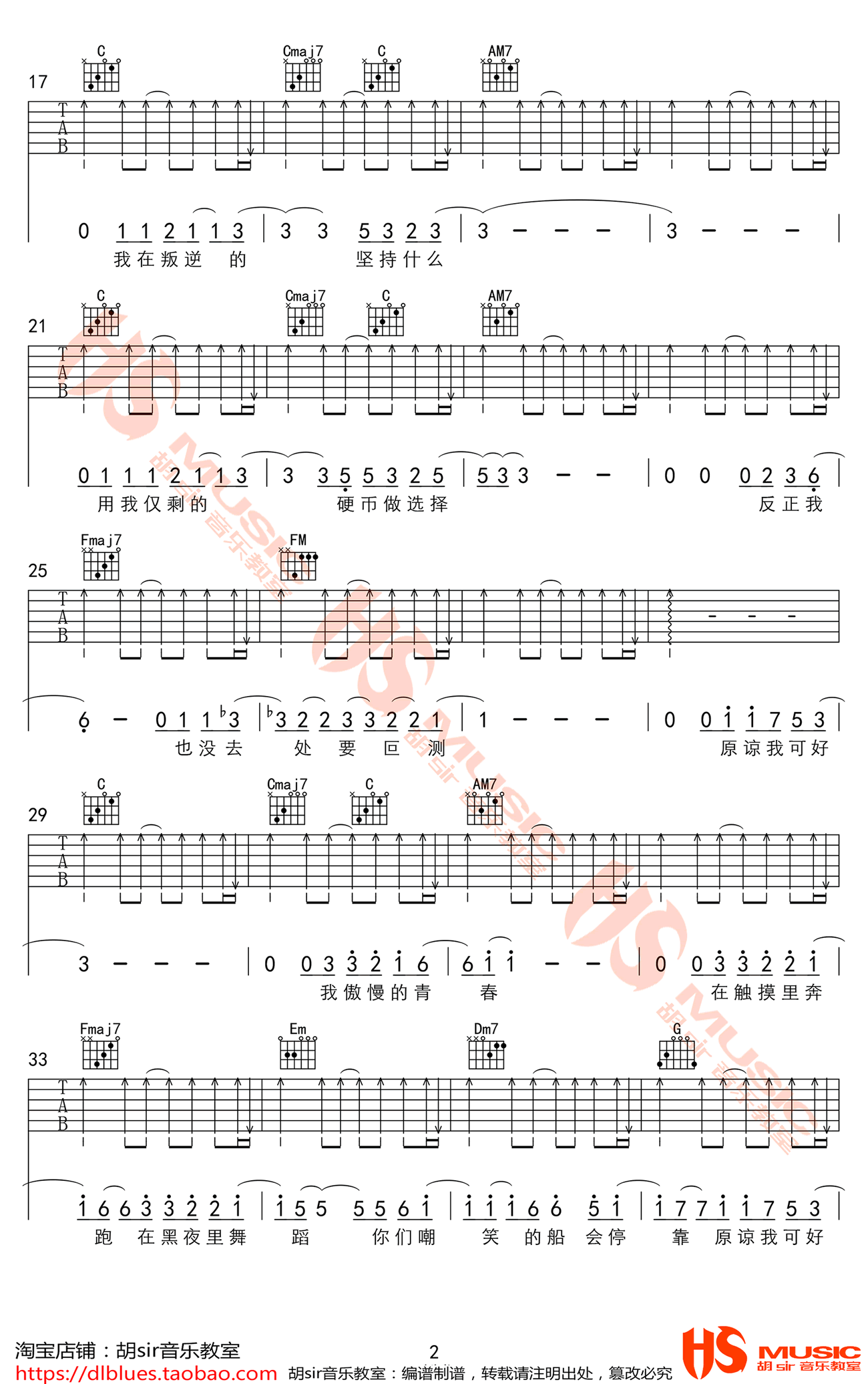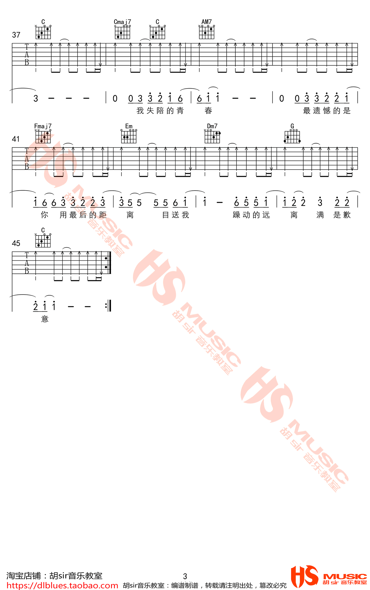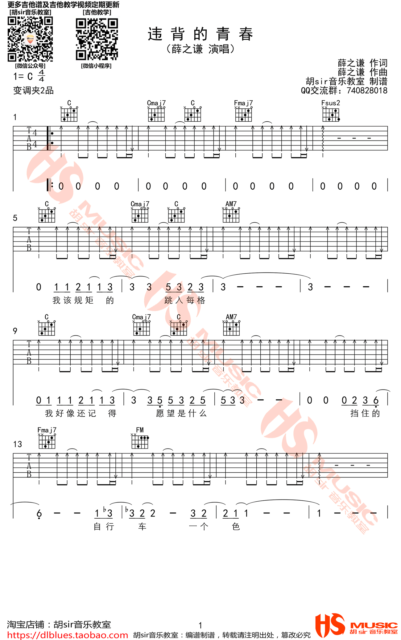 曲谱介绍: 薛之谦《违背的青春》吉他弹唱谱,采用C调指法编配,共有3张高清图谱。