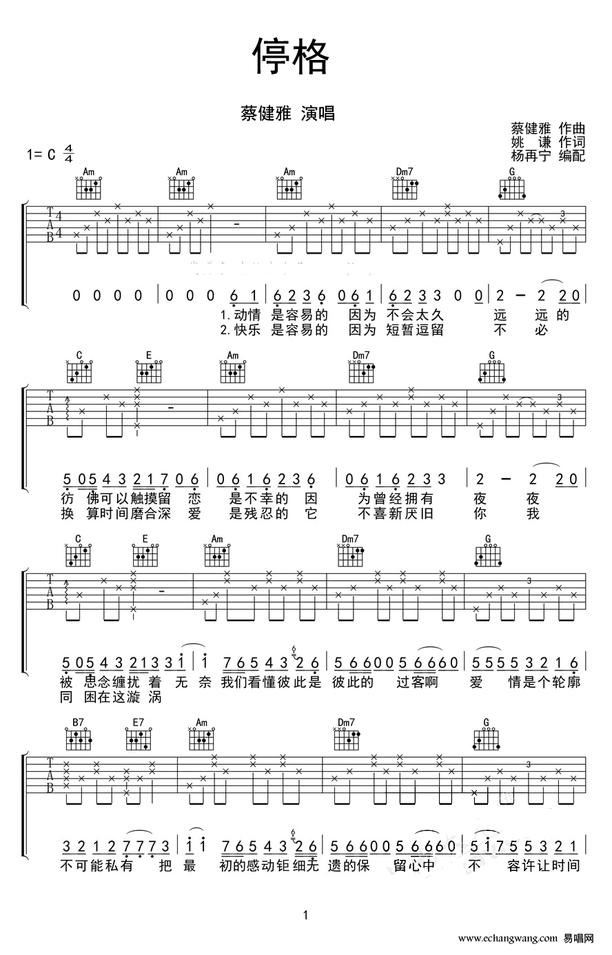 曲谱介绍: 蔡健雅《停格》吉他弹唱谱,采用C调指法编配,共有2张高清图谱,免翻页排版设计。