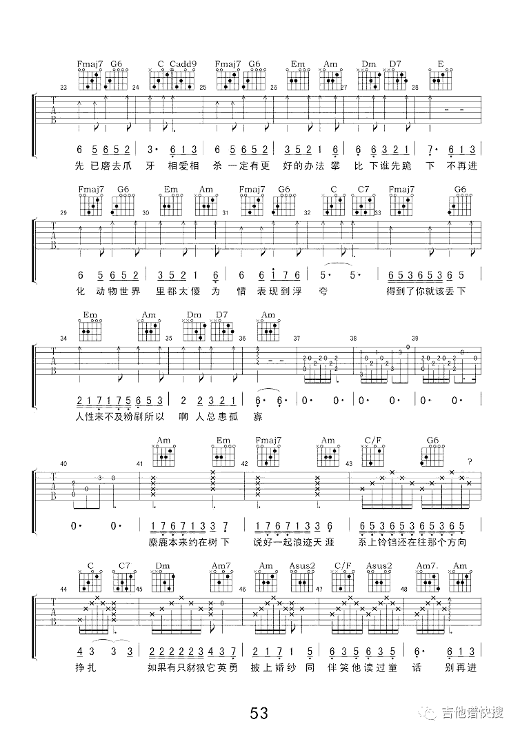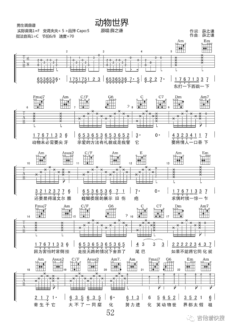 曲谱介绍: 薛之谦《动物世界》吉他弹唱谱,采用C调指法编配原版,共有3张高清图谱。