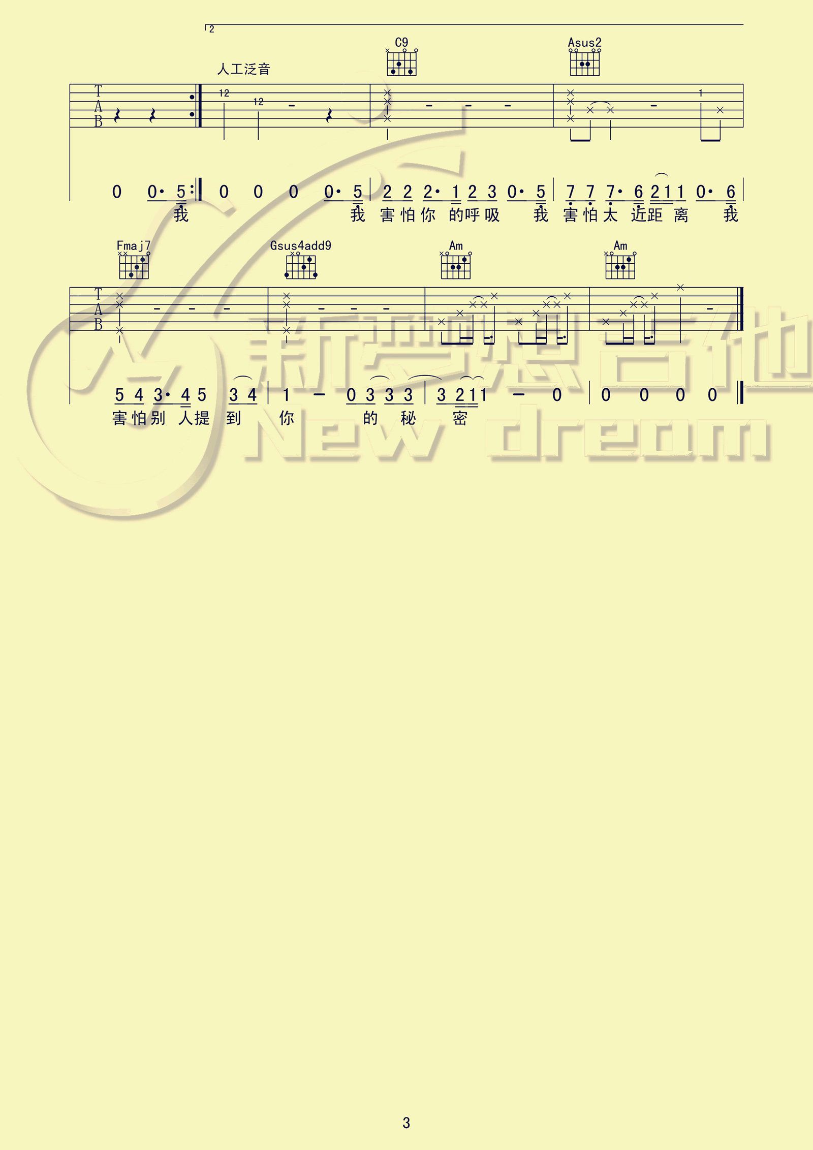 曲谱介绍: 薛之谦《我害怕》吉他弹唱谱,采用C调指法编配,共有3张高清图谱。