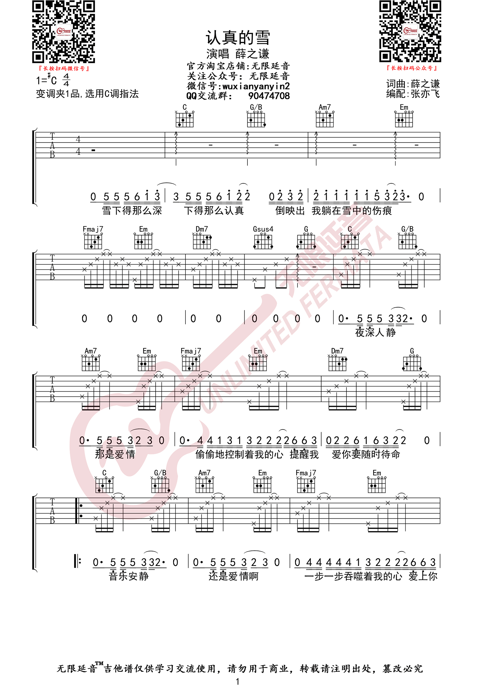 曲谱介绍: 薛之谦《认真的雪》吉他弹唱谱,采用C调指法编配原版,共有3张高清图谱。
