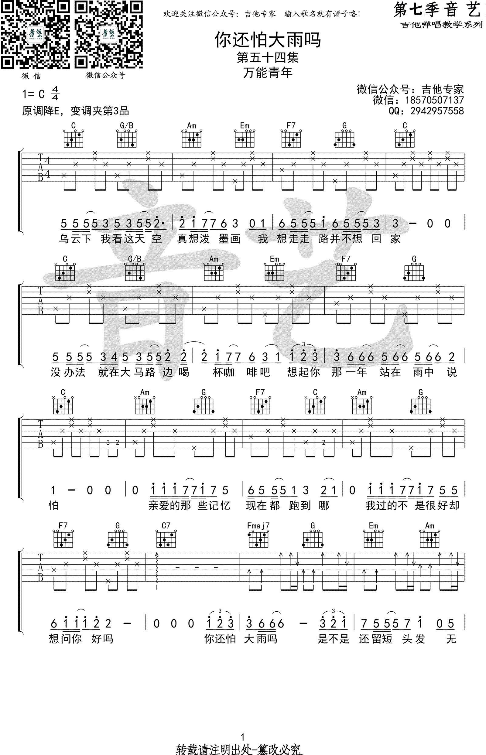 曲谱介绍: 周柏豪/万能青年旅店《你还怕大雨吗》吉他弹唱谱,采用C调指法编配,共有2张高清图谱,免翻页排版设计。