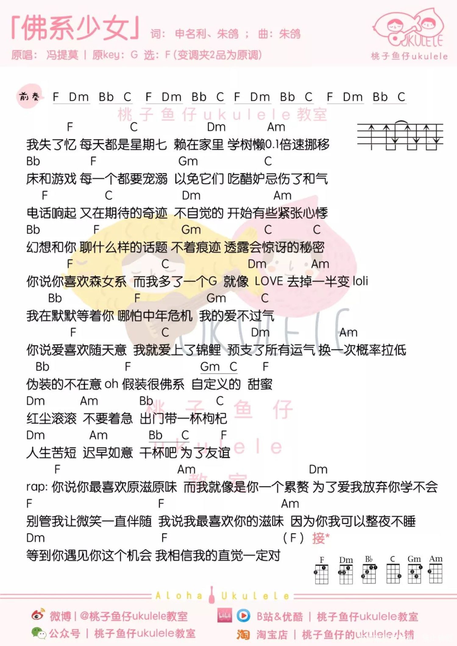 曲谱介绍: 新的一年,元气乐甜的冯提莫一改之前的爵士风,想不到提莫的小清新也是如此的清丽脱俗。歌词将爱情中心里的小悸动诠释的淋漓尽致,这首佛系少女里,可爱俏皮,还加入了rap,甜甜蜜蜜仿佛溢出~   《佛系少女》尤克里里谱