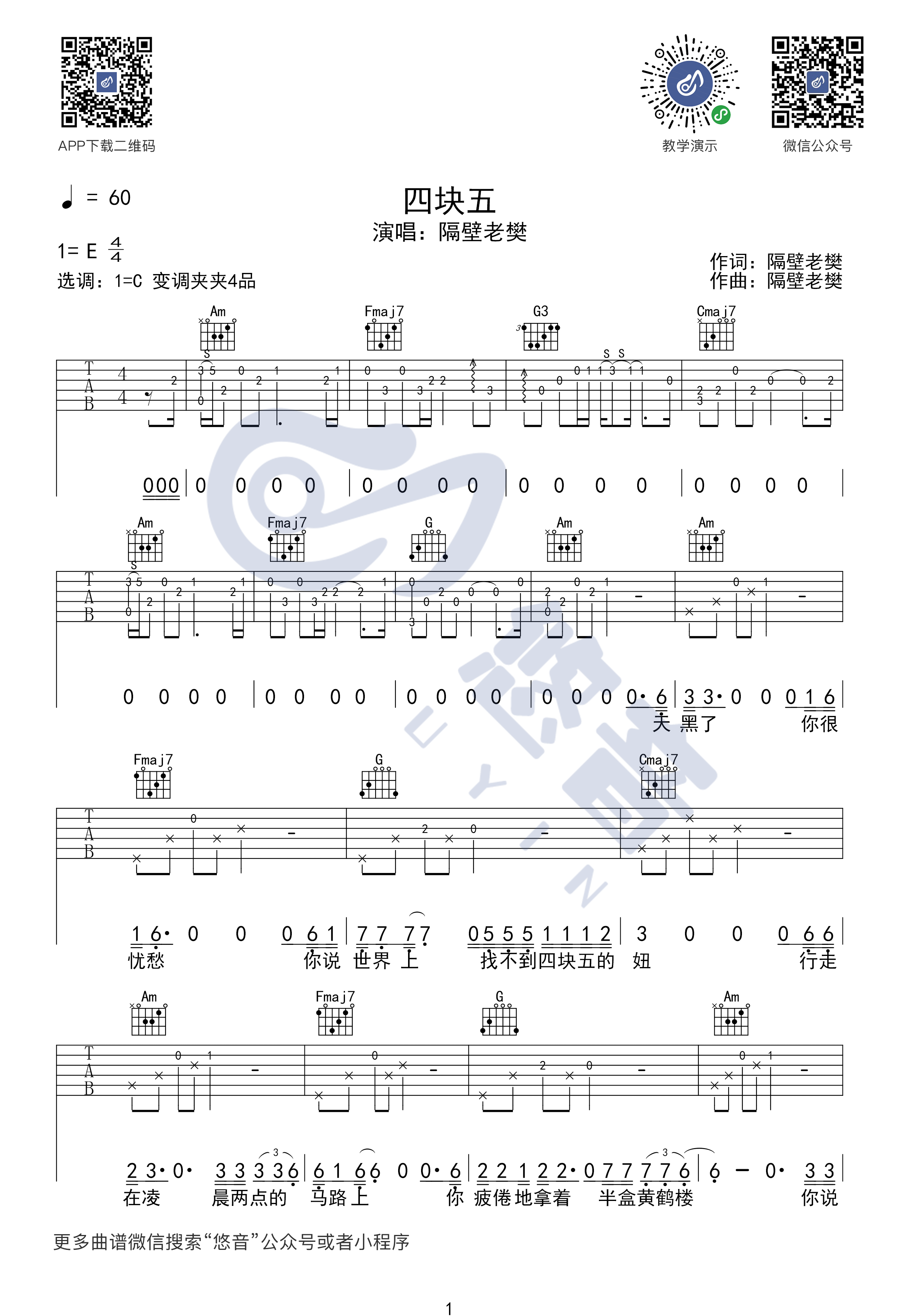 曲谱介绍: 隔壁老樊《四块五》吉他弹唱谱,采用C调指法编配,共有4张高清图谱。