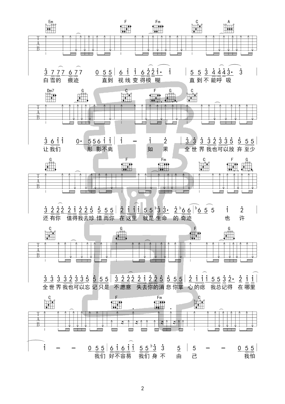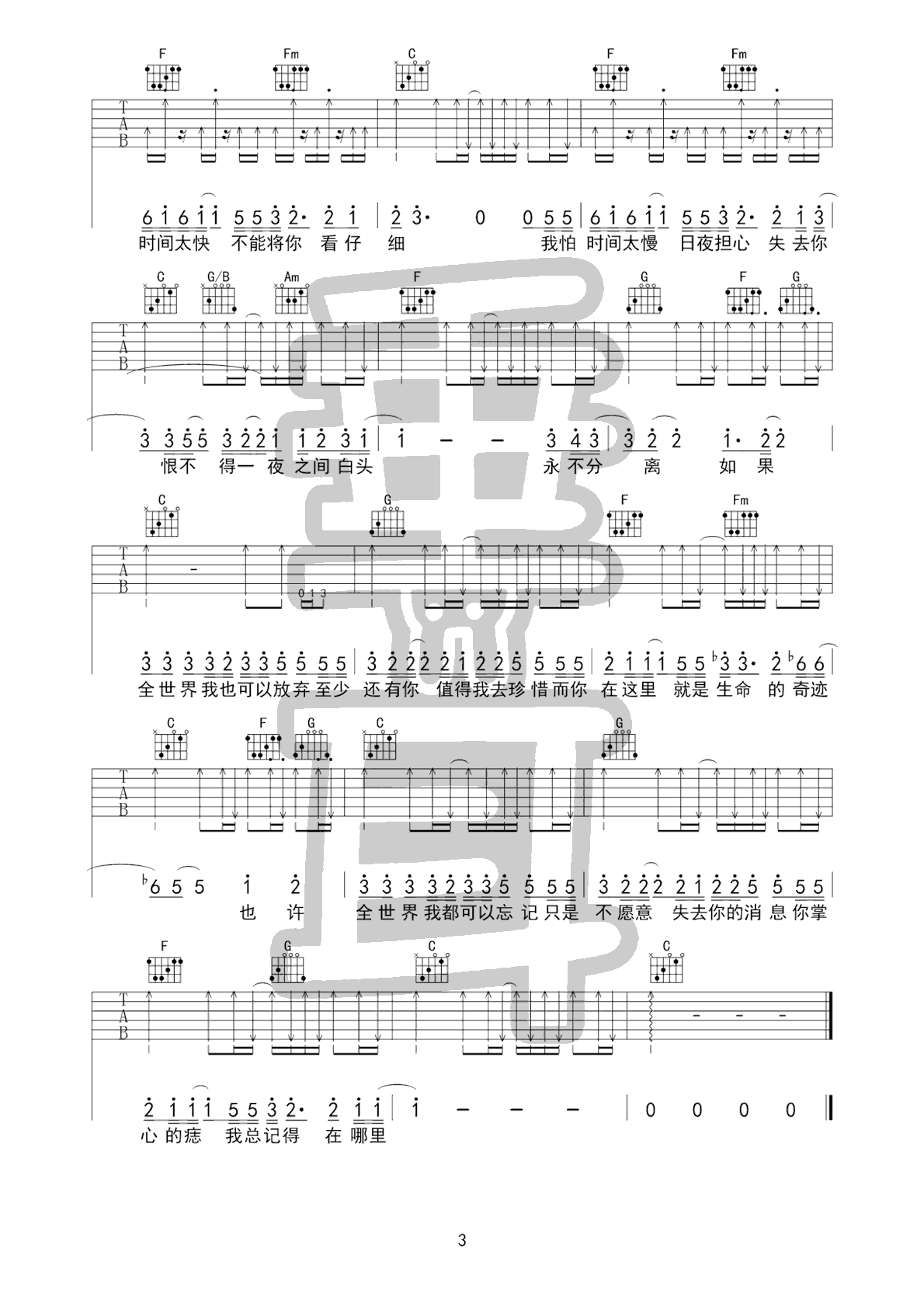 曲谱介绍: 林忆莲《至少还有你》吉他弹唱谱,采用C调指法编配原版,共有3张高清图谱。