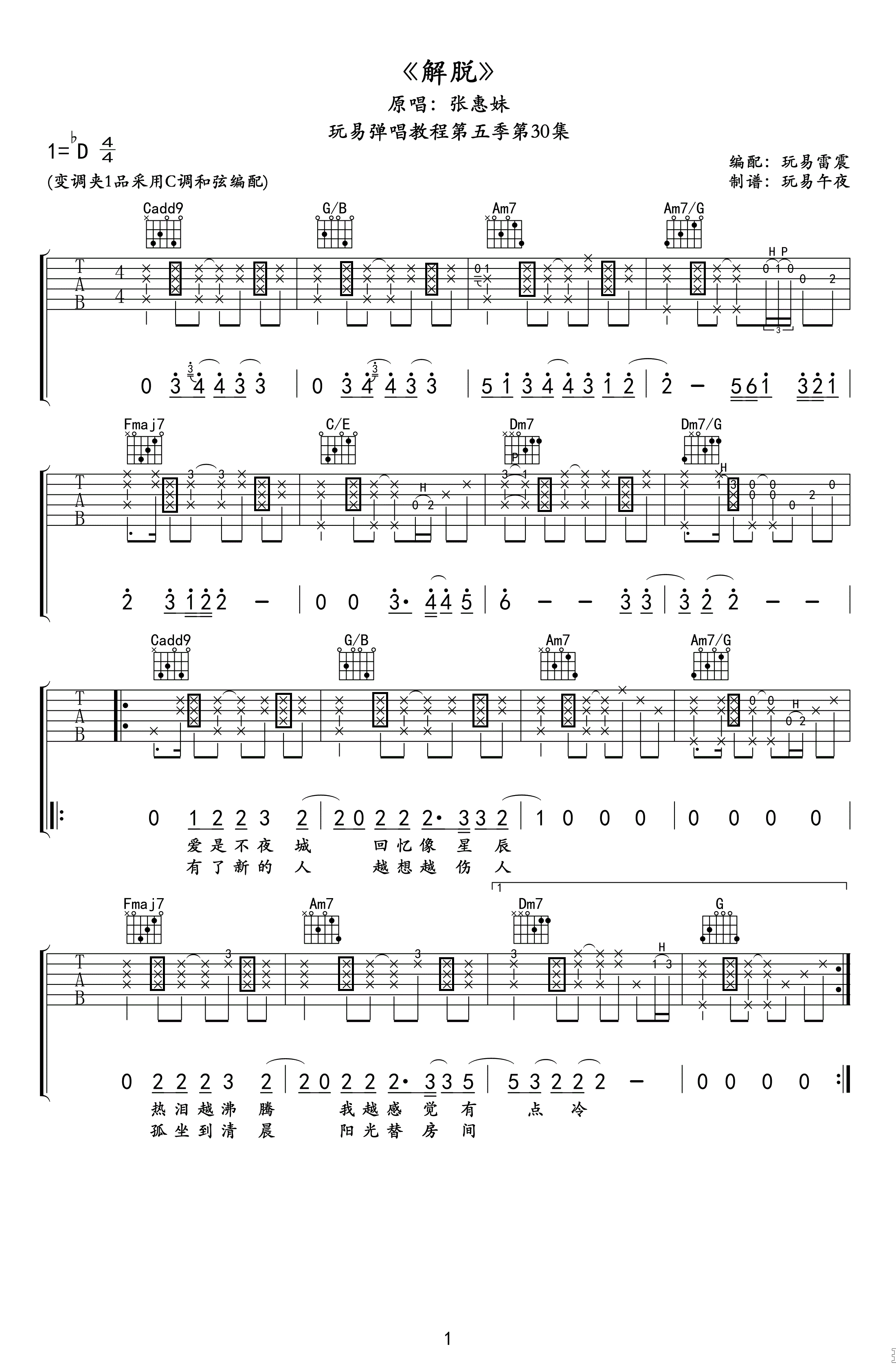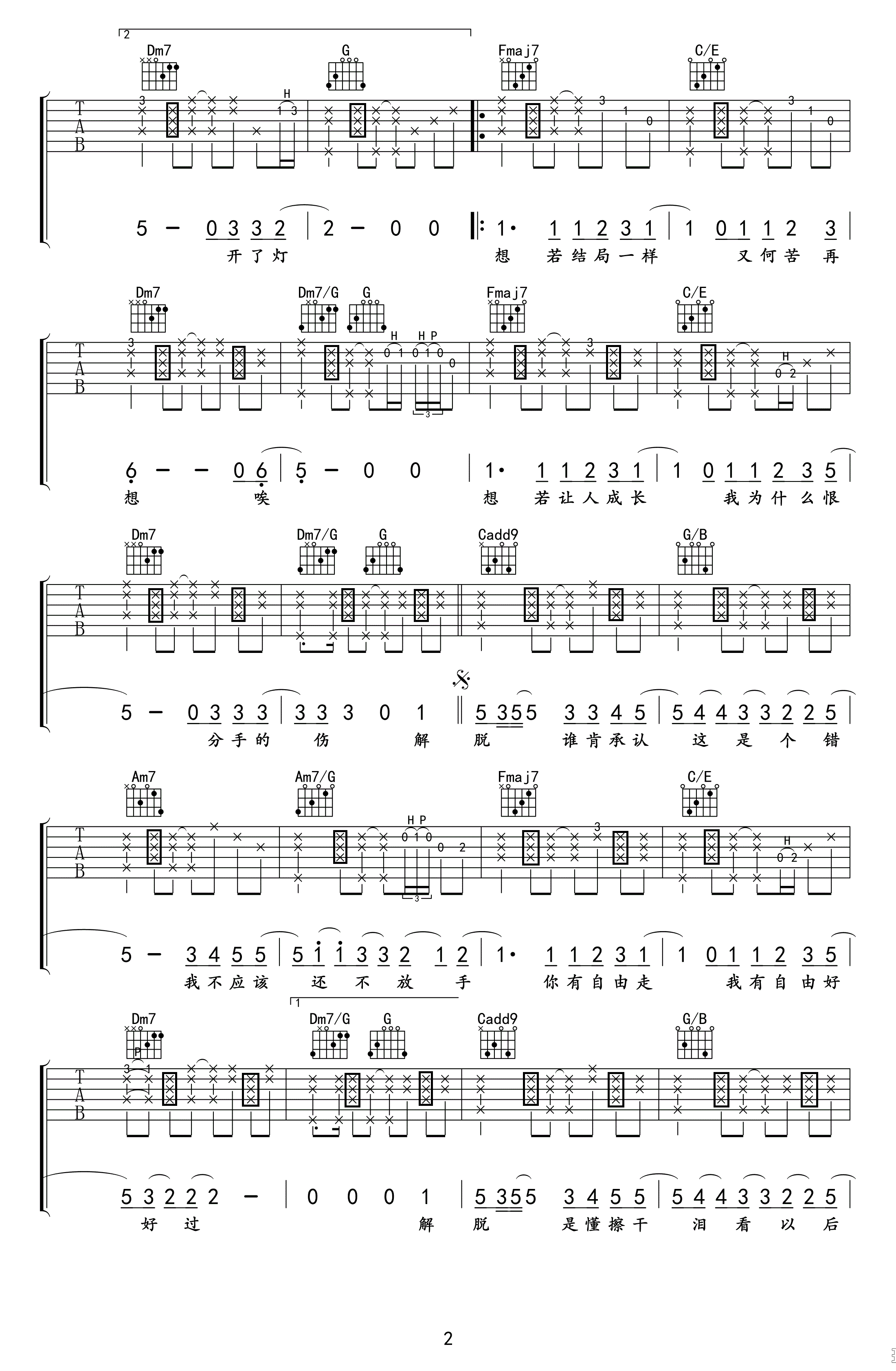曲谱介绍: 张惠妹《解脱》吉他弹唱谱,采用C调指法编配原版,共有2张高清图谱,免翻页排版设计。