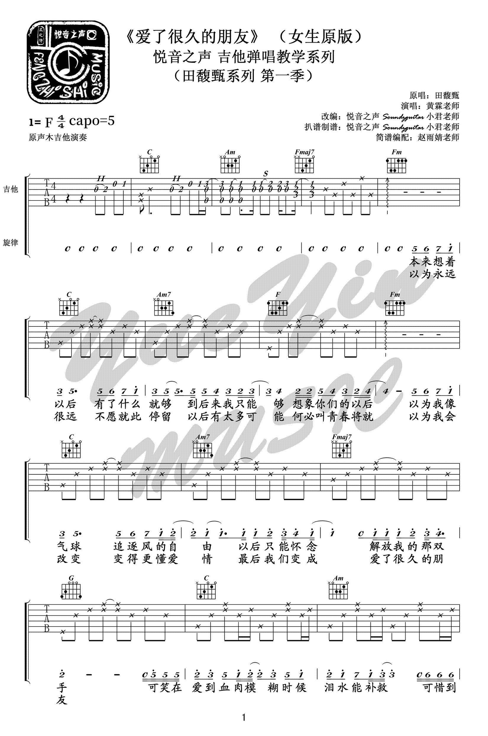 曲谱介绍: 田馥甄《爱了很久的朋友》吉他弹唱谱,采用C调指法编配原版,共有3张高清图谱。